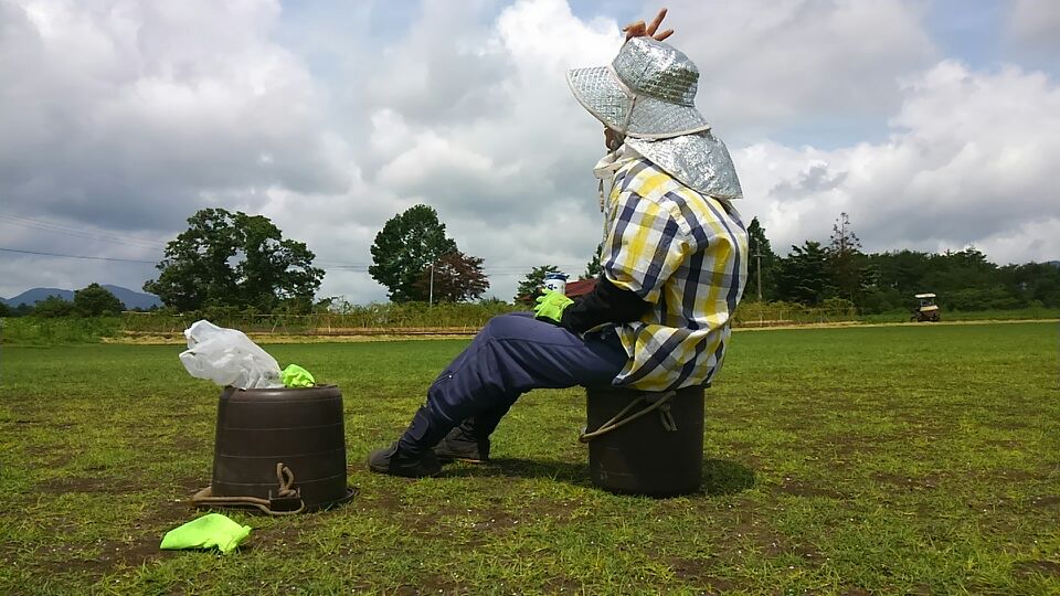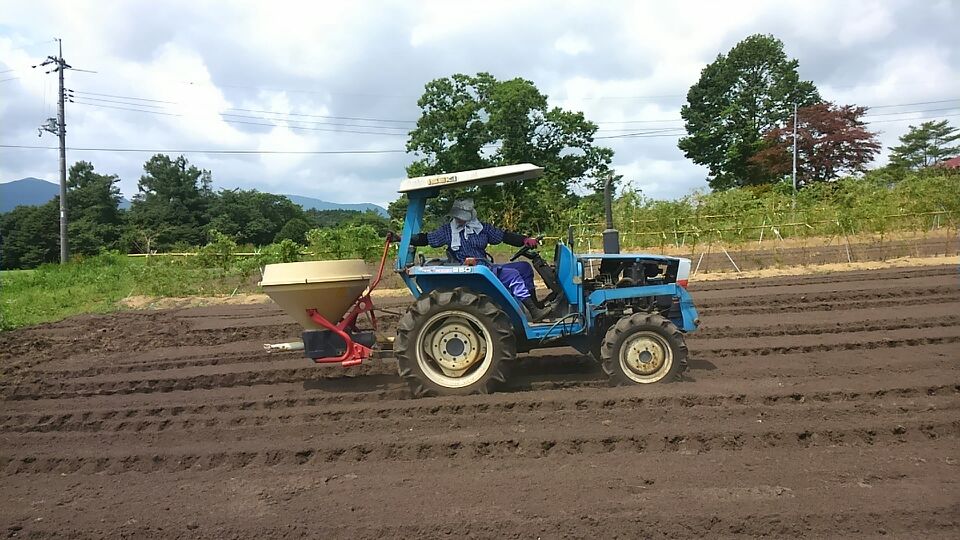 せっちゃん登場~♪ キャベツの苗を植える前に、畑に数種類の肥料をふっています!後ろの棒が左右に素早く動き、まるでアヒルの尻尾みたいでイトオカシ(笑)
