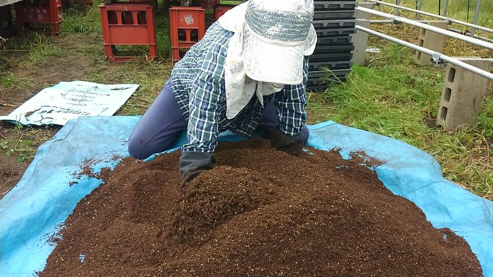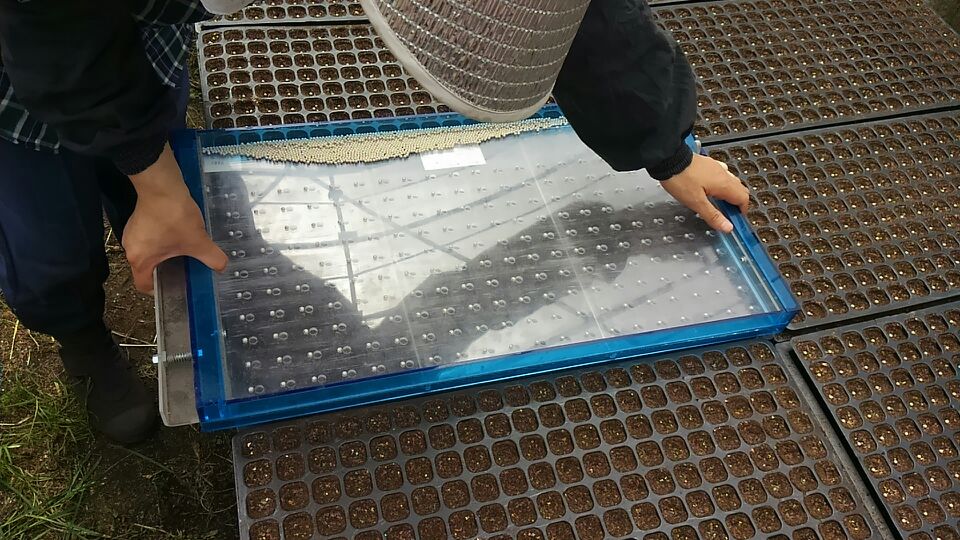 コーティングしたキャベツの種を200個の穴に入れ、一気にポットの中に落とします♪ ガッチャンッ!!! ポトッ!!!