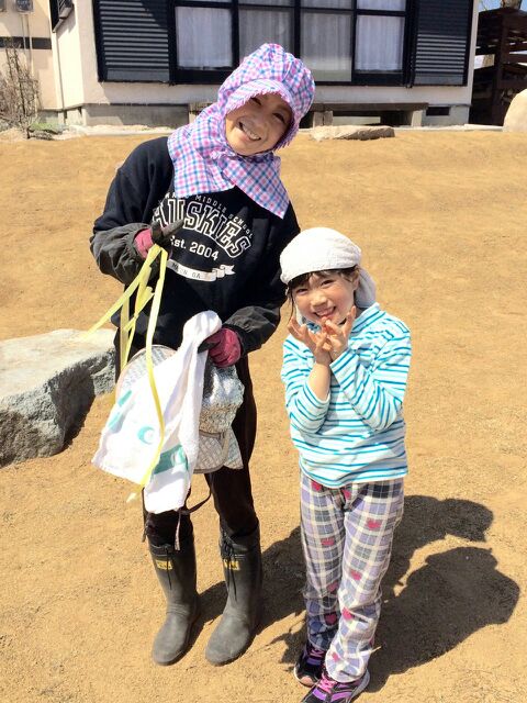 張り芝作業完了後、『3月17日同盟』のツーショット~(^^) 姪っ子のみゆちゃんは、なかなか我が家のお仕事を手伝う機会がないので、今回のお泊りで良い経験になったのではないかな~(*´▽`*)