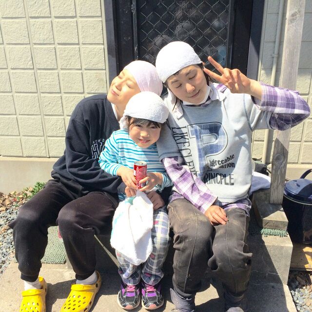 休憩タイムにお茶を持ってきた長女が、我が子をおんぶしながらサンダル姿で参入!
