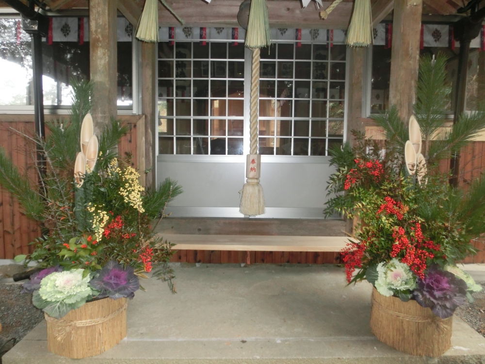 去年の12月平松神社は遷宮をしました。当屋になったこともあり門松をしてみました。たくさん実のついたフクラシが少なく苦労しました。どうでしょうか?