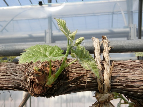 加温してから約1か月。ピオーネ、シャインマスカットの芽が出てきました。出てきていないところに霧吹きで水分補給。祈るように芽が出るのを待っています。