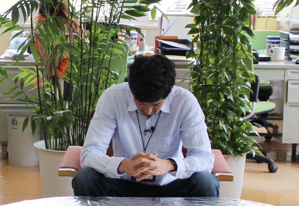 撮影前の様子。いつもにこやかなセンター長が固まっています。