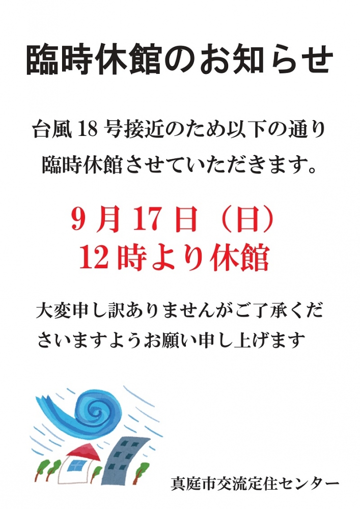 【台風接近】臨時休館のお知らせ【9月17日】