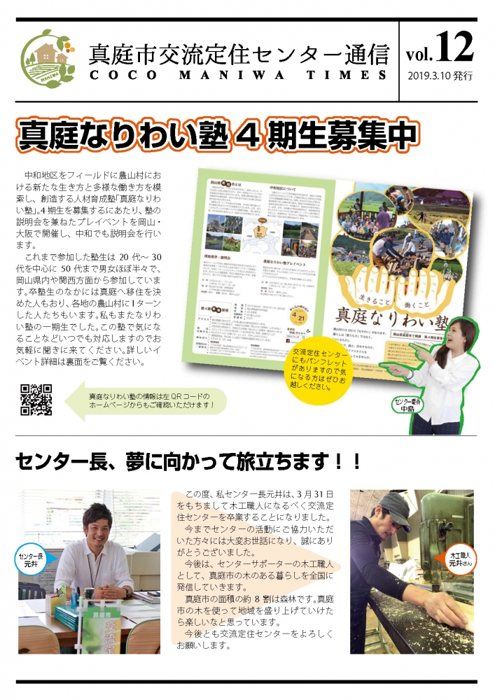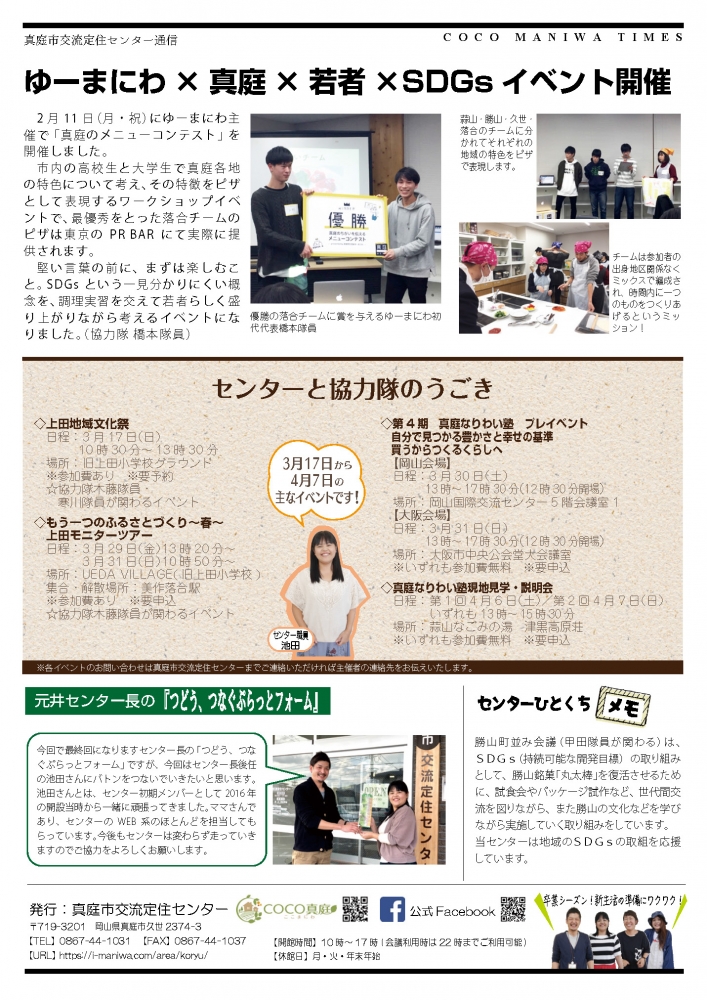 今月は真庭市が関係人口をはかる取り組みとして進めている「真庭なりわい塾」のことや、SDGs未来杜市に選ばれた真庭市で、実際にSDGsのイベントを企画した協力隊の橋本隊員率いる「ゆーまにわ」のことや、センター長の卒業に向けてご挨拶の記事を掲載しております。