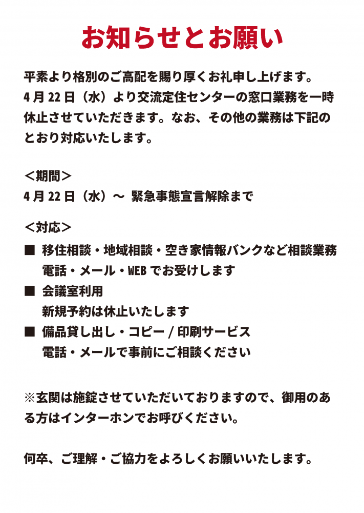 本日、4/22(水)より交流定住センターの窓口業務を休止させていただきます。