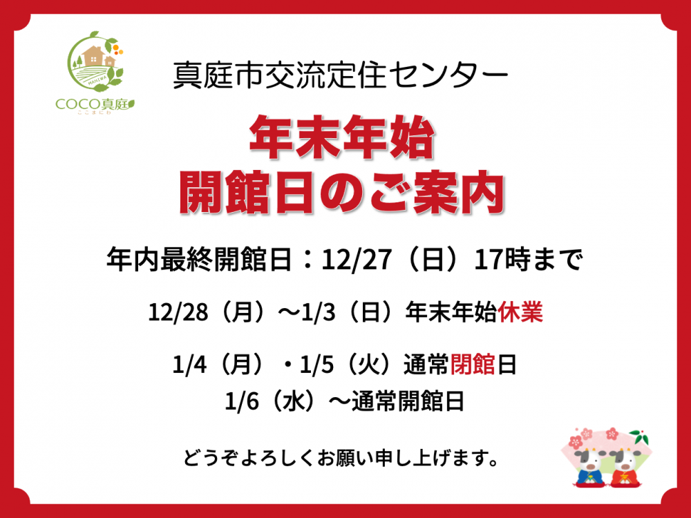 交流定住センターの冬季休業についてのお知らせです。