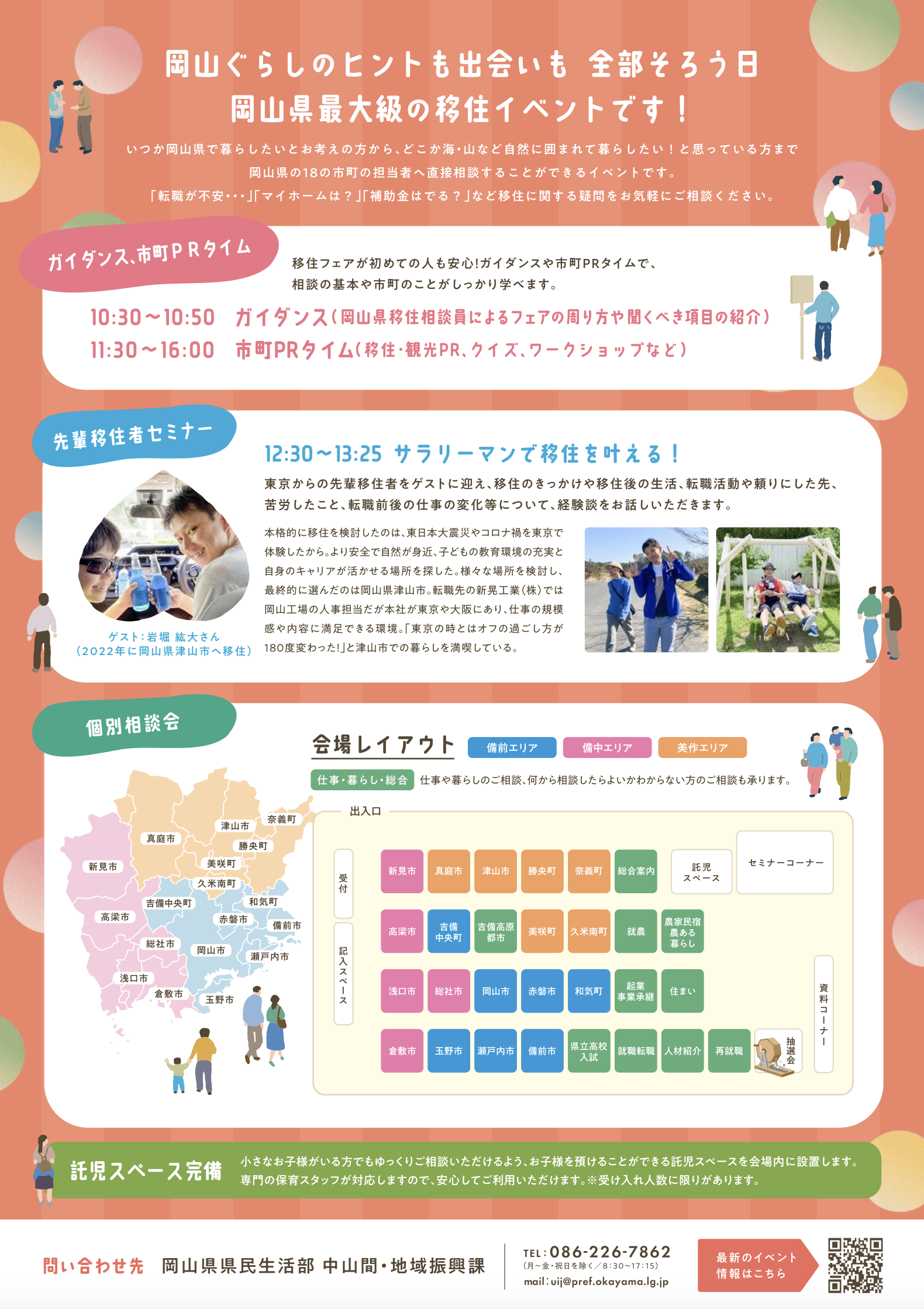 市町村別の相談ブースや先輩移住者セミナー、お楽しみ抽選会など、さまざまな催しが予定されています。