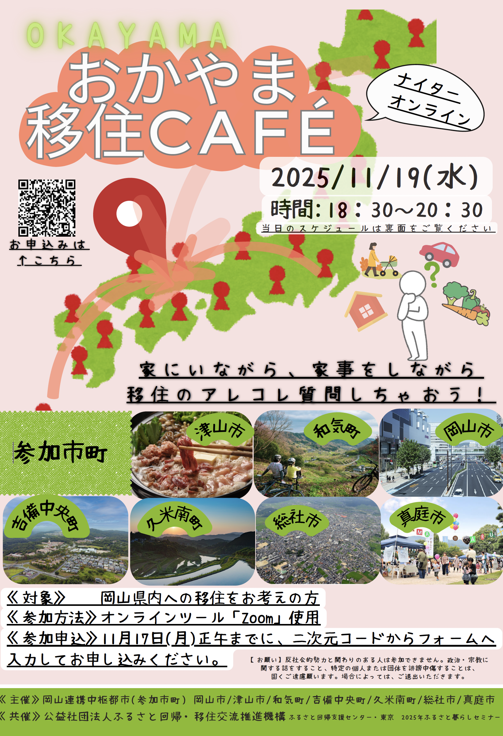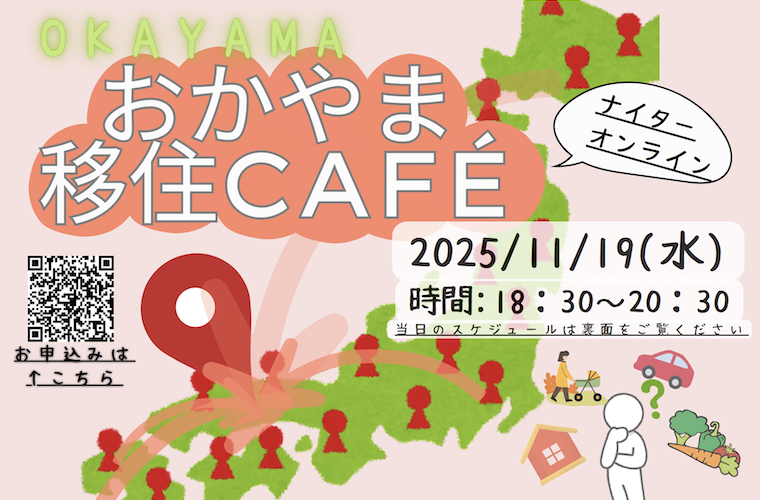 11/19(水)に、岡山県内の7市町が集まって、オンラインイベント「おかやま移住Café」を開催します!