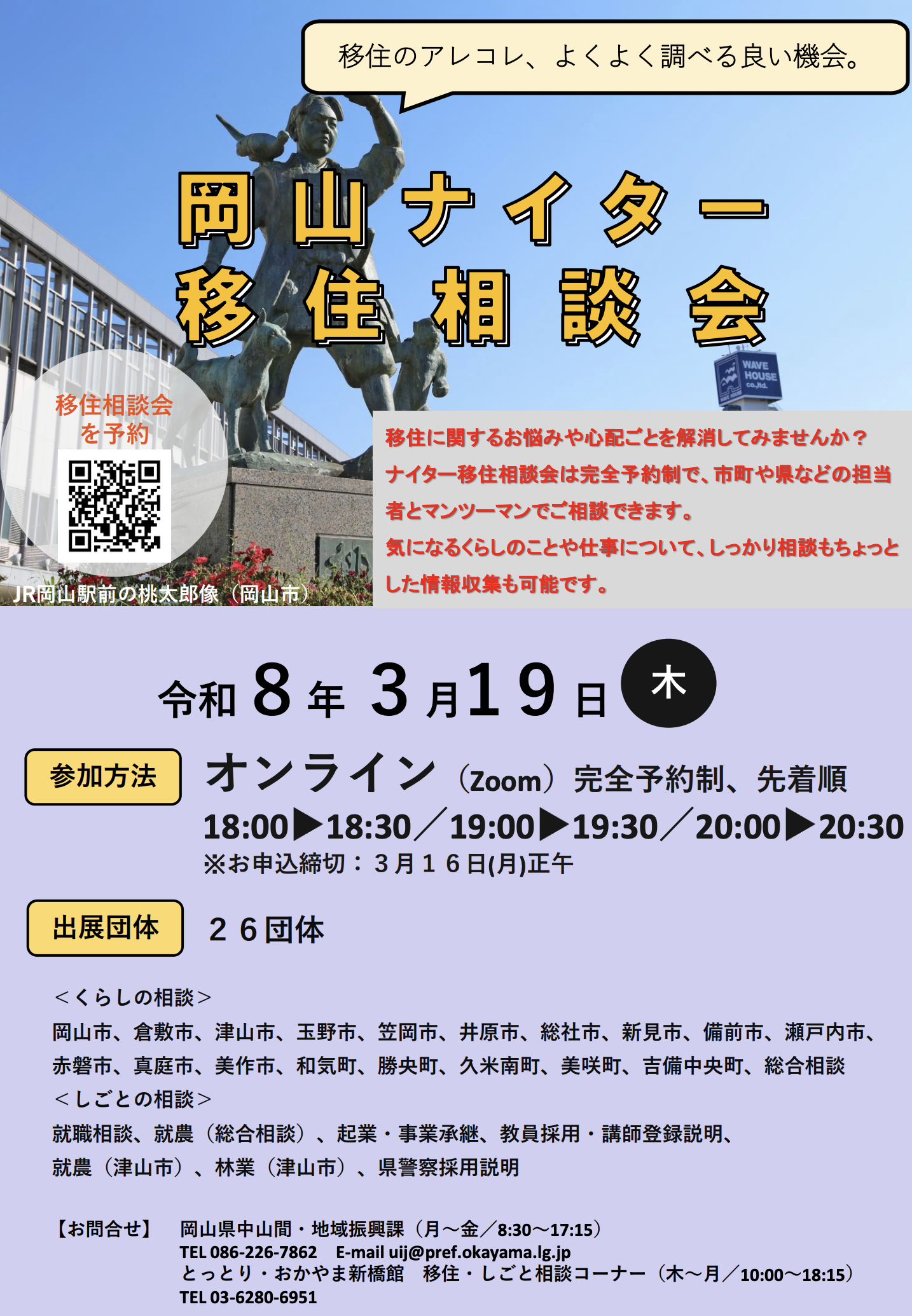 「岡山ナイター移住相談会」は、毎月第3木曜日の夜にオンラインで開催されている移住相談会です。