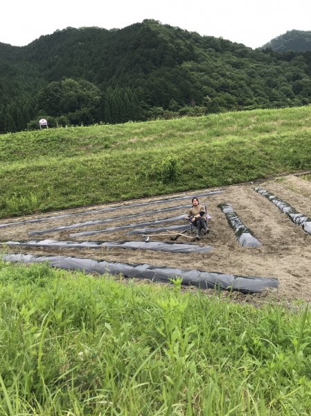 わっせわっせと管理機で耕し、4徳ジョレンで畝を立てること8つ