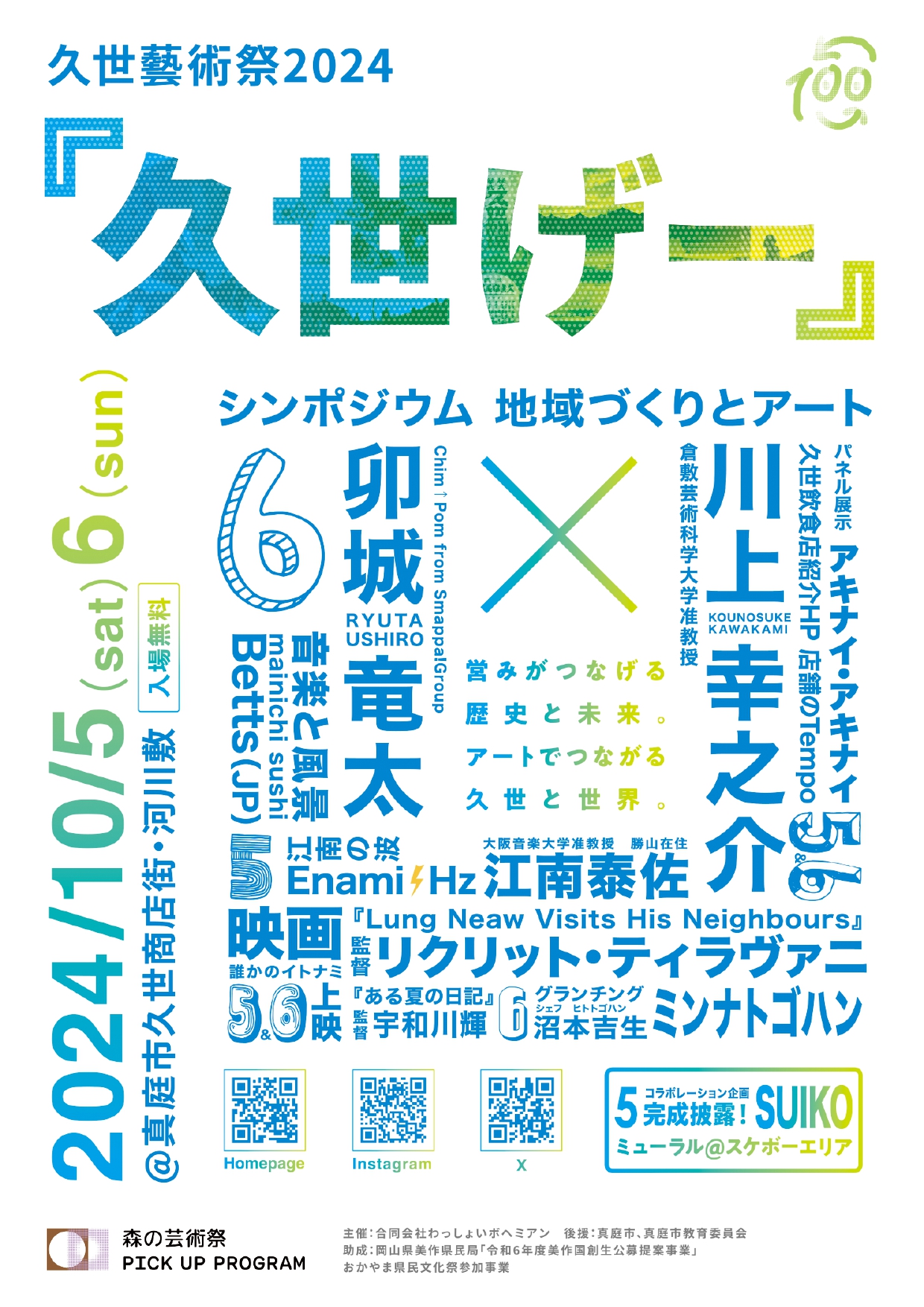 『久世げー』は、ローカルの視点から「森の芸術祭」を受け入れて持続的な地域活性を実現するために、アートがつなげる「人・食・カルチャー・未来」を久世地域から創造、発信し、繋がり、楽しむことで、外の世界との持続的な関係を築くことをねらいとしています。