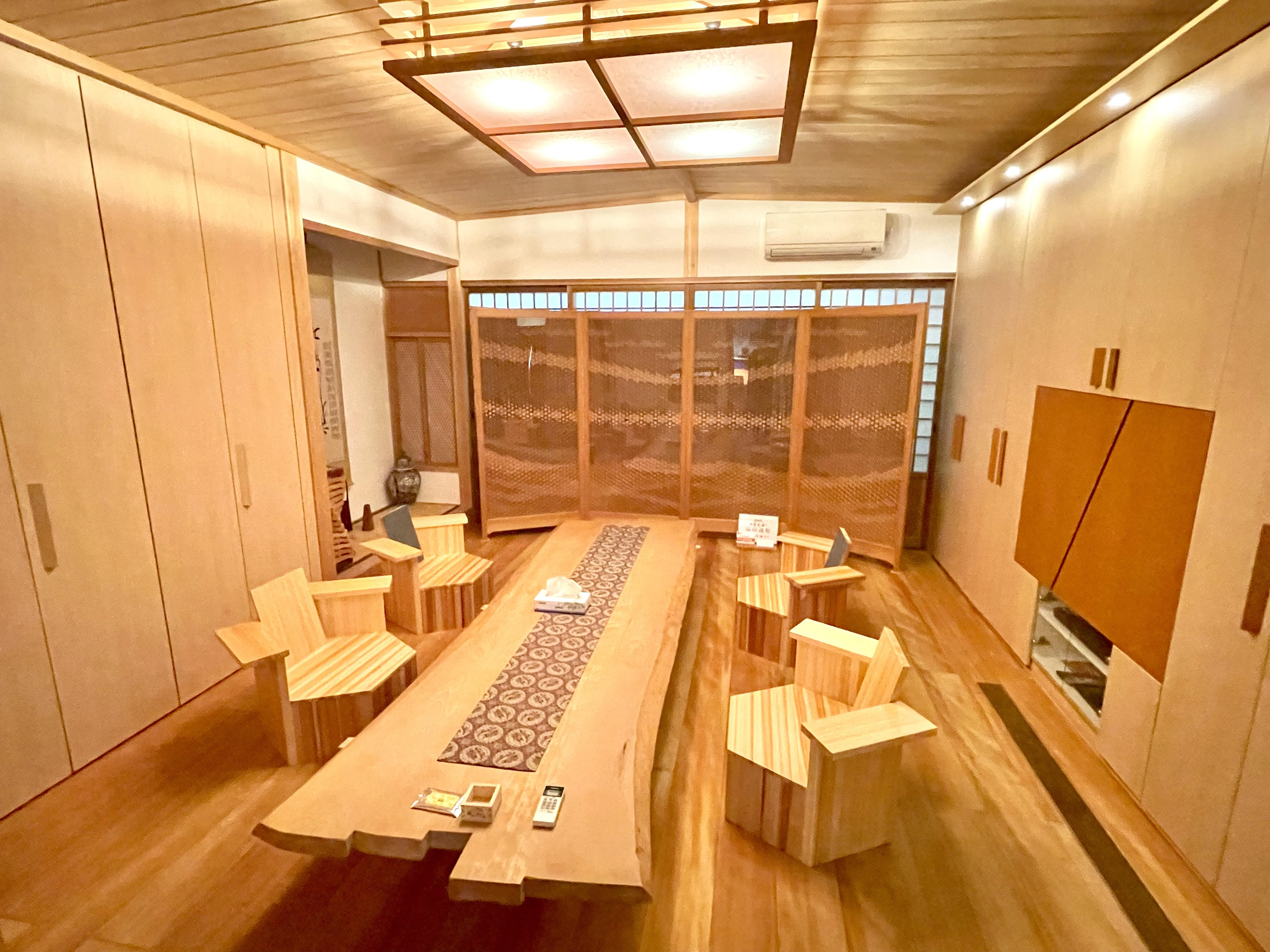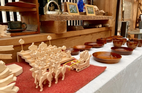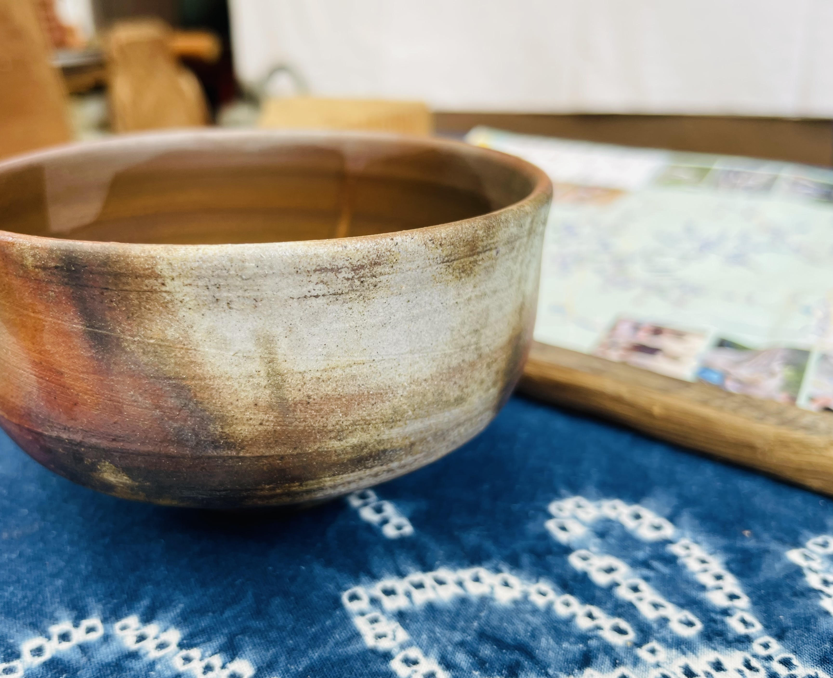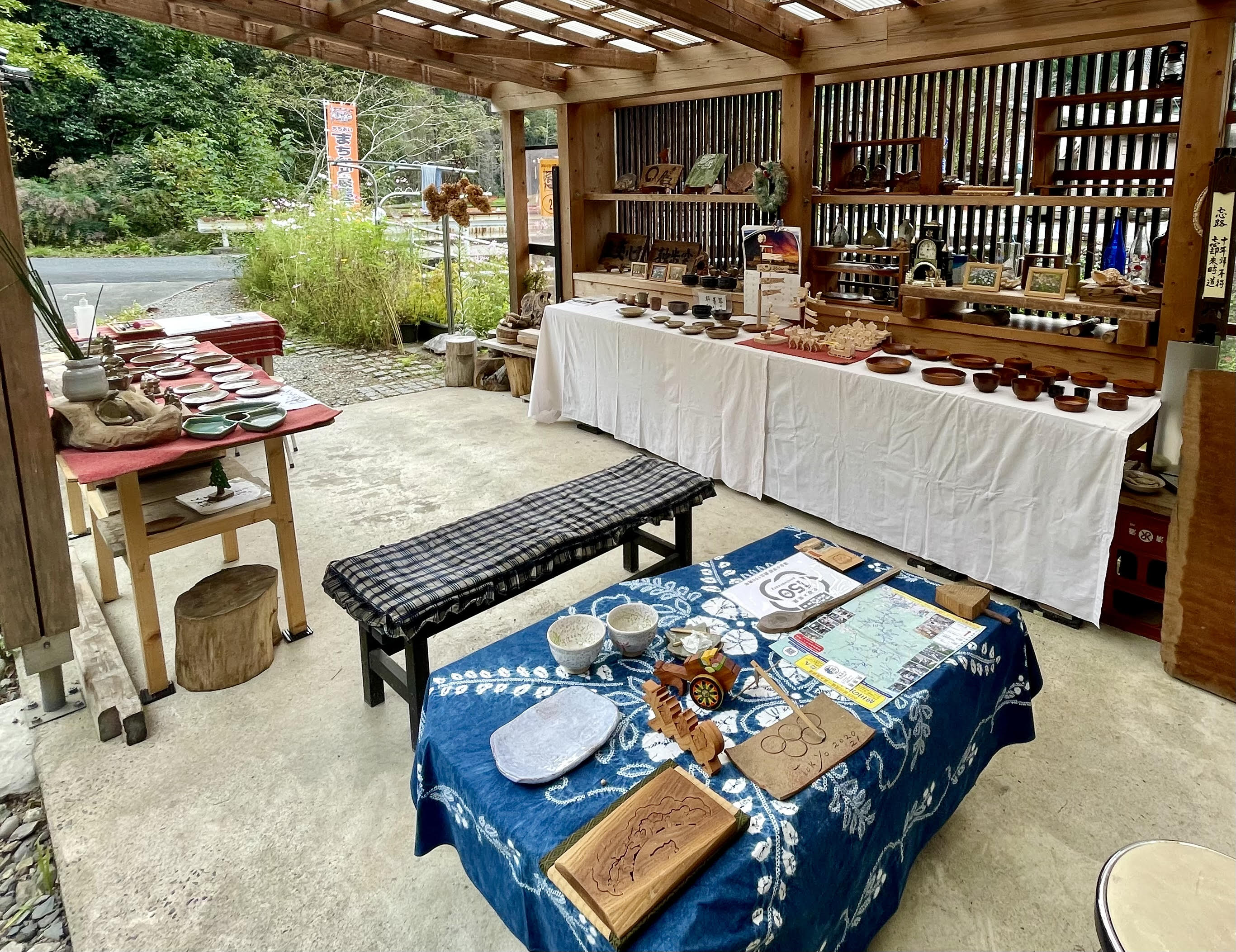 展示会場には、陶器・木工作品が並び、素敵な茶室で抹茶とお菓子をお出しして頂きました。