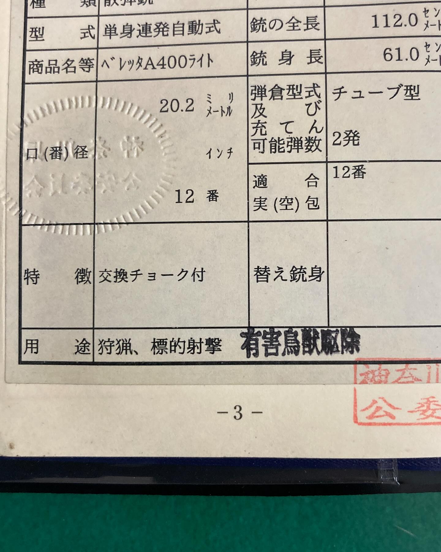 有害鳥獣駆除許可証の種別に「銃器」の記載がある事を確認し、その許可証と委嘱状を持って警察へ申請しに行きます。