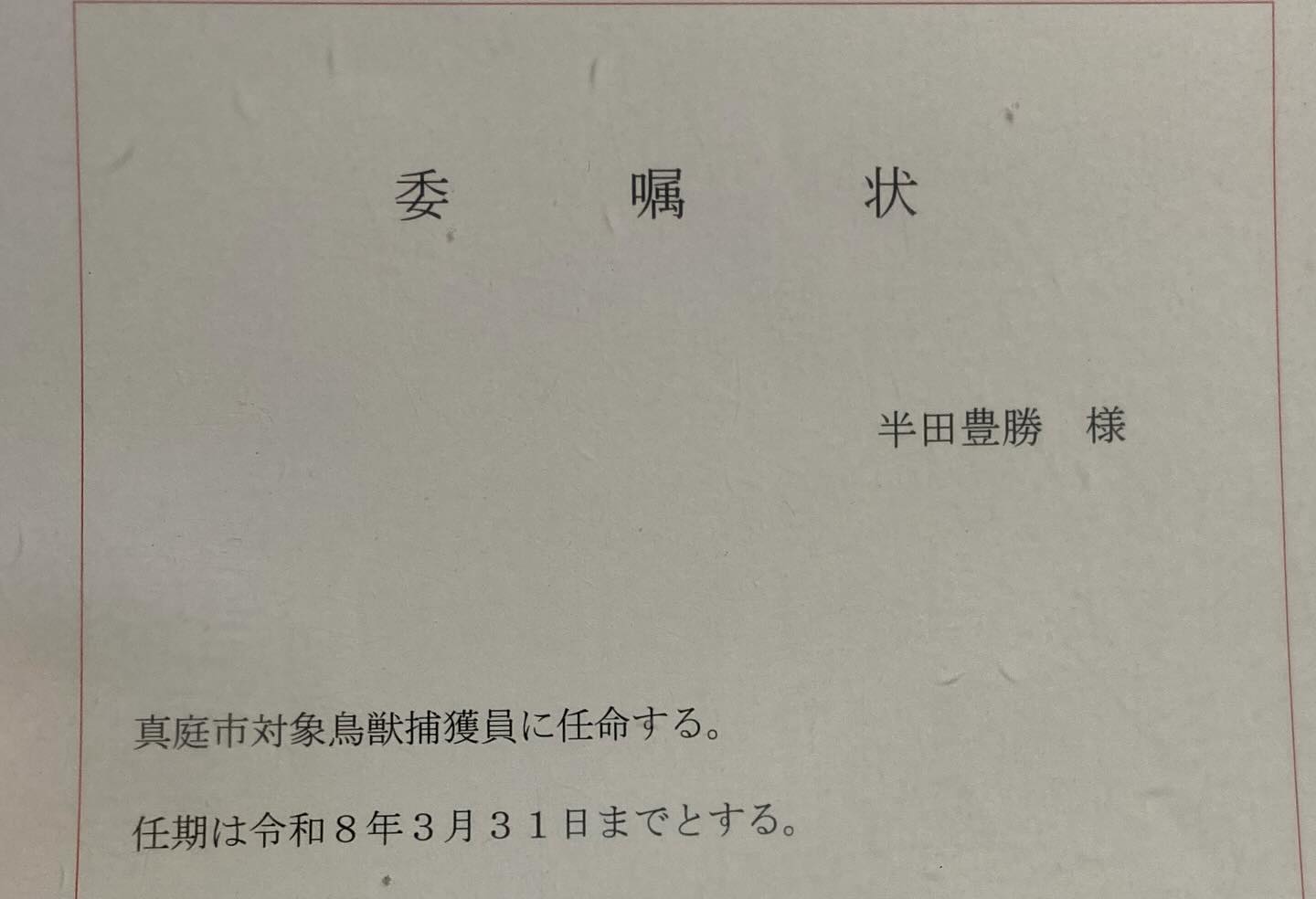 任命後、有害鳥獣駆除の許可証、対象鳥獣捕獲員としての委嘱状が渡されます。
