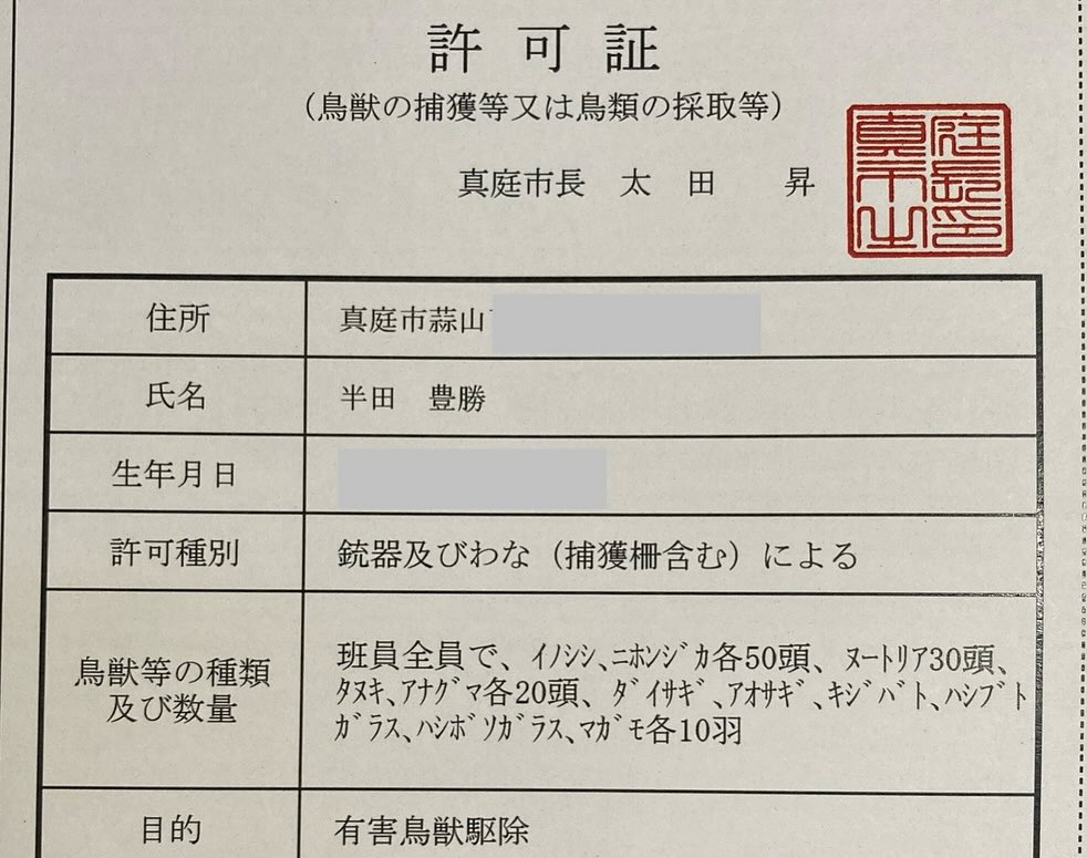 今までは「狩猟、標的射撃」のみでしたので、新たに「有害鳥獣駆除」を加えてもらう必要があります。