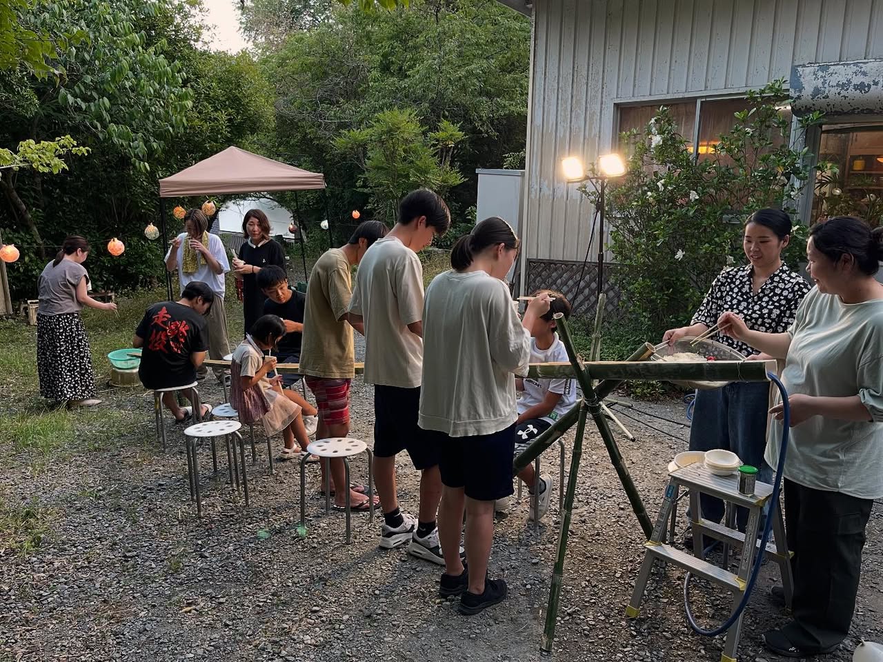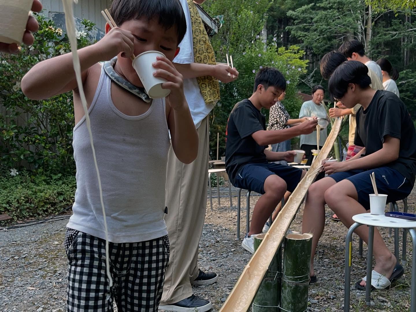 当日は、朝早くから子どもたちを含む約10名が手伝いに来てくださり、流しそうめんが始まる頃には会場は大盛り上がりとなりました。