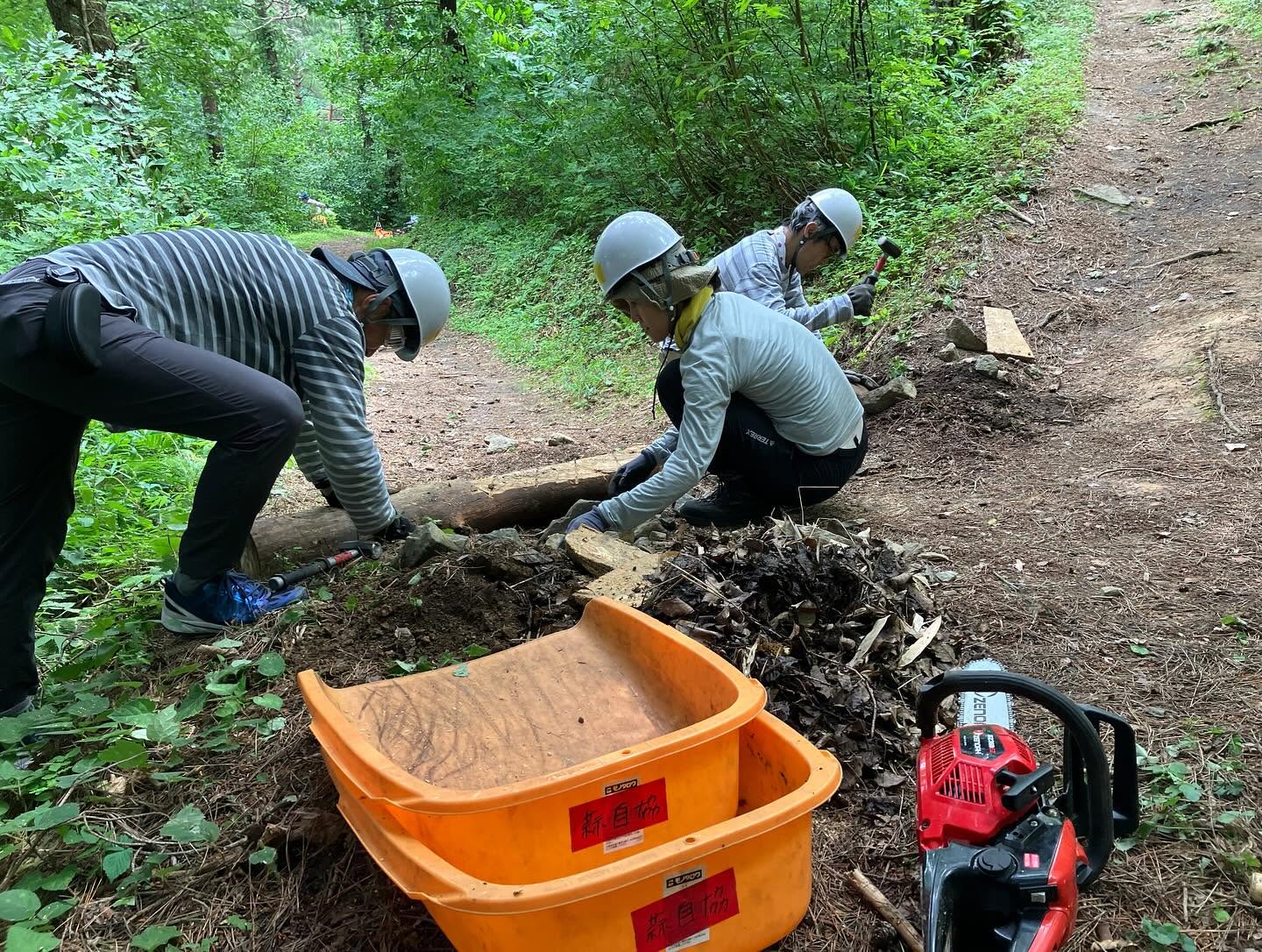 今日は二班に分かれ、合計4ヶ所について、雨水の流量を分散させるための水切りなどについて施工をしました。