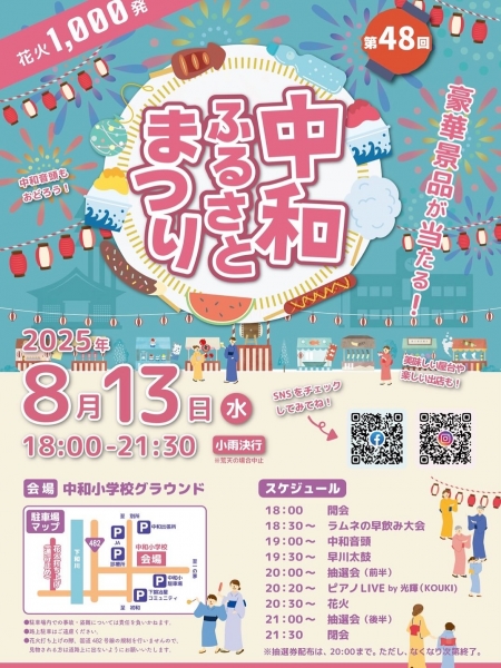 今年で48回目となる中和ふるさと祭りでは、屋台や出店はもちろん、ステージイベントや演奏、豪華景品が当たる抽選会も開催されます。