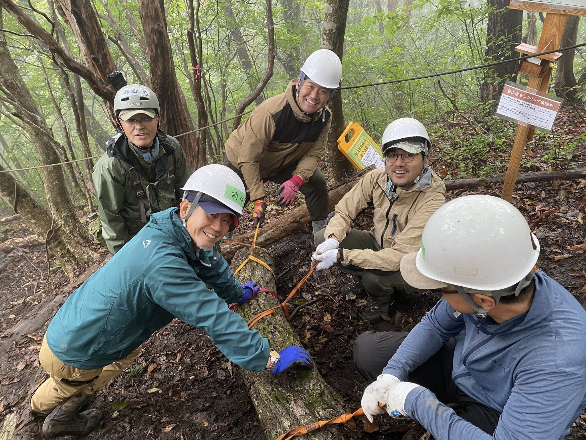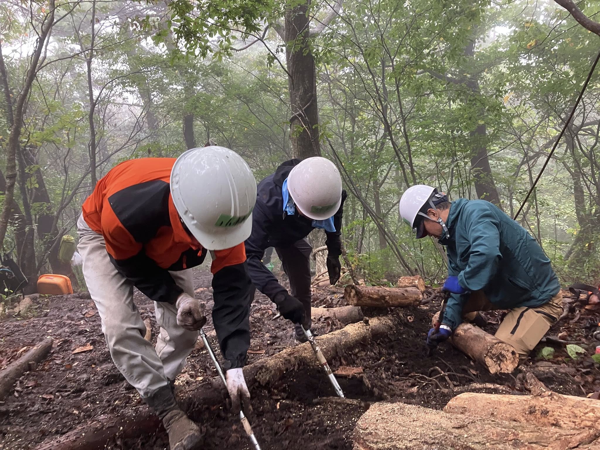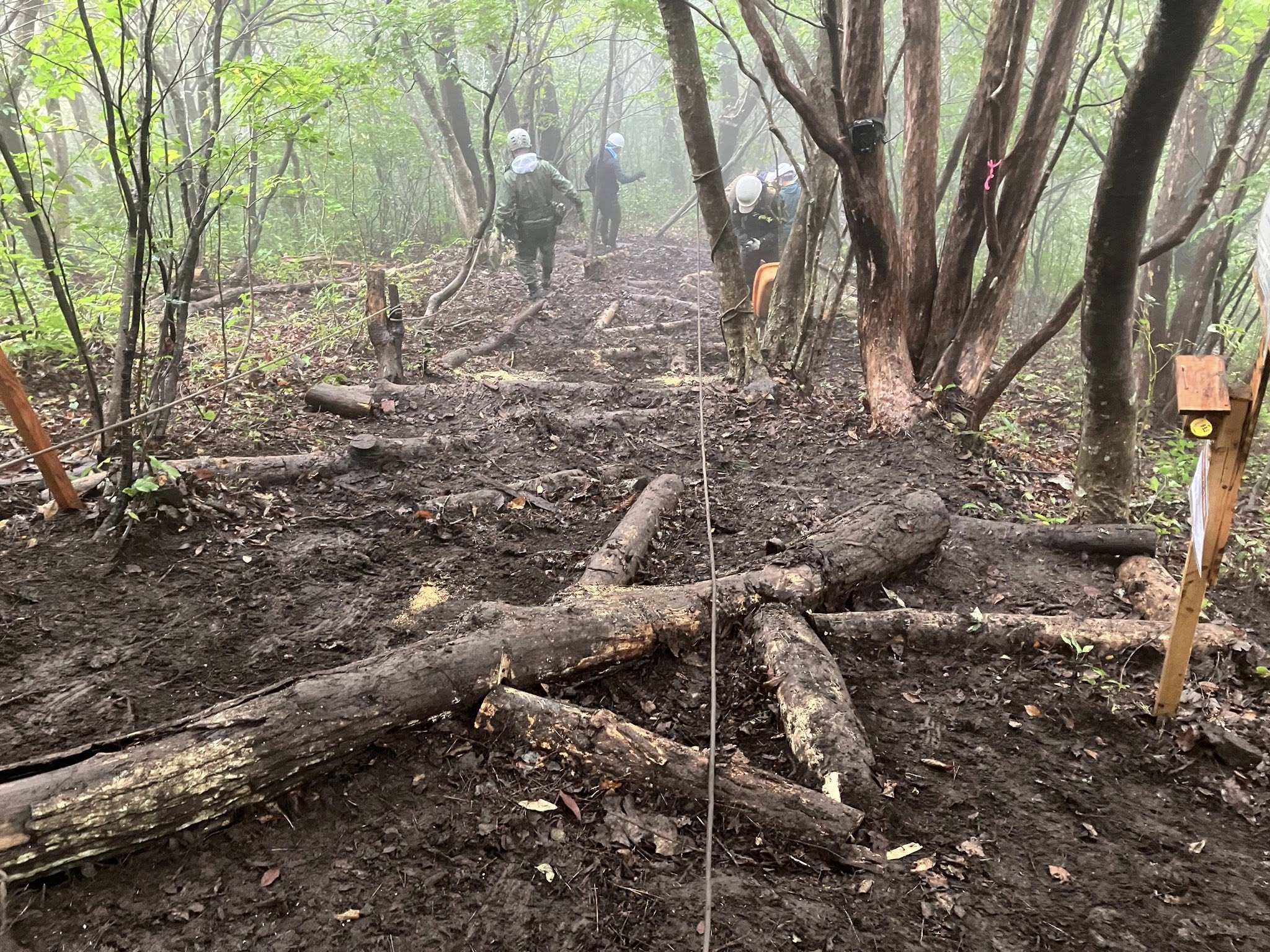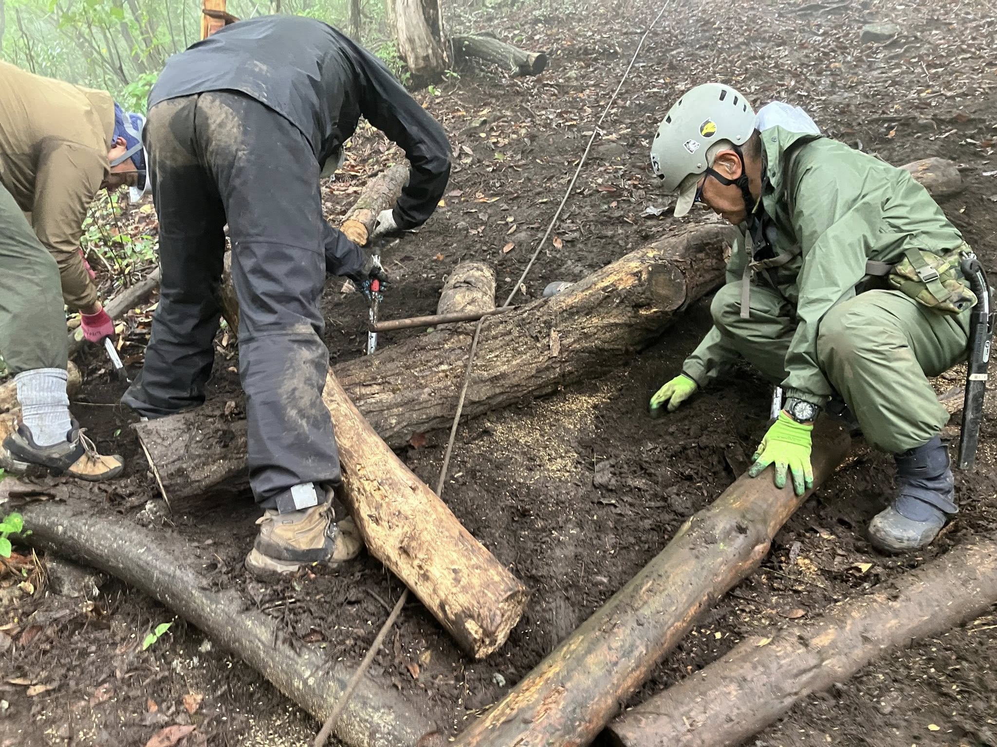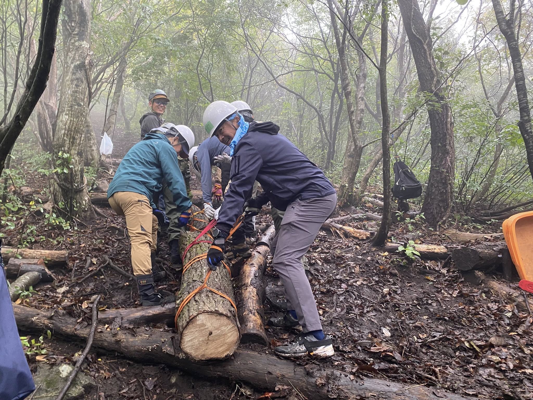 枯れ木を伐採して作った丸太を全員で運んで、土砂流出を防ぎ、登山道の足場確保、植生回復も狙った階段のような形を作る土木作業!