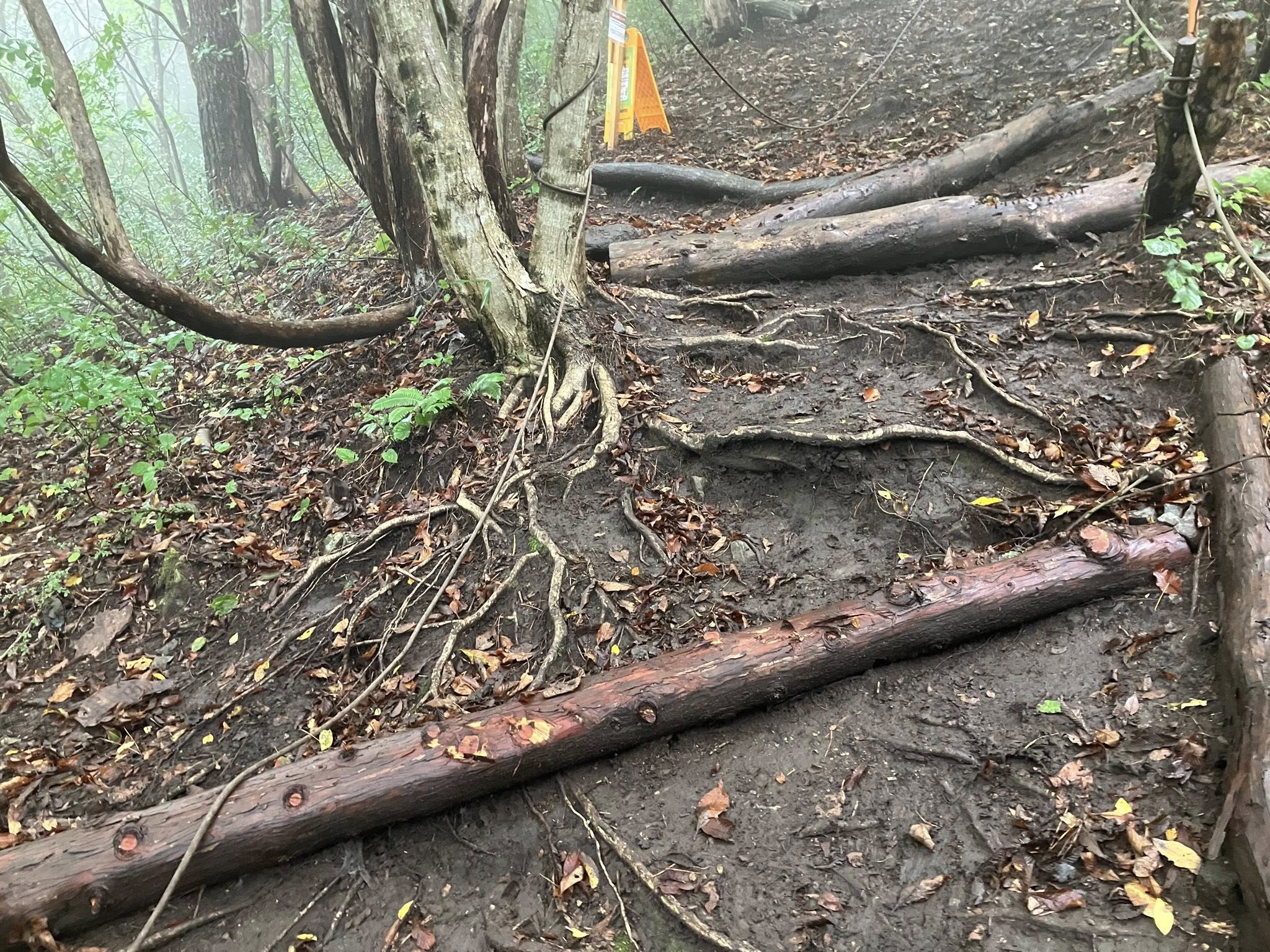 前日〜朝イチまで雨が降っていた影響で地面のぬかるみが強く、急傾斜の登山道で、まるで滑り台(笑)