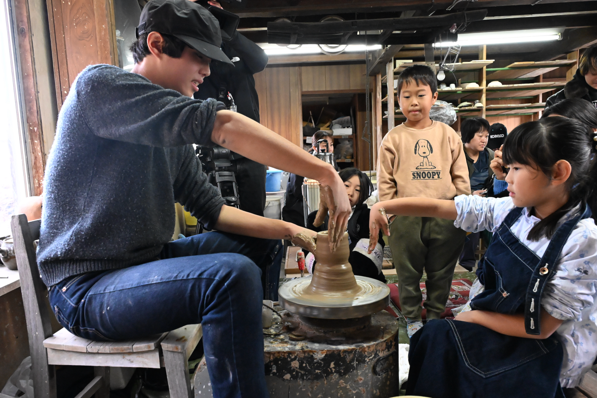 準備ができたのち、子どもたちが順番に電動ろくろでの整形作業を細見隊員と向き合う形で体験していきます。