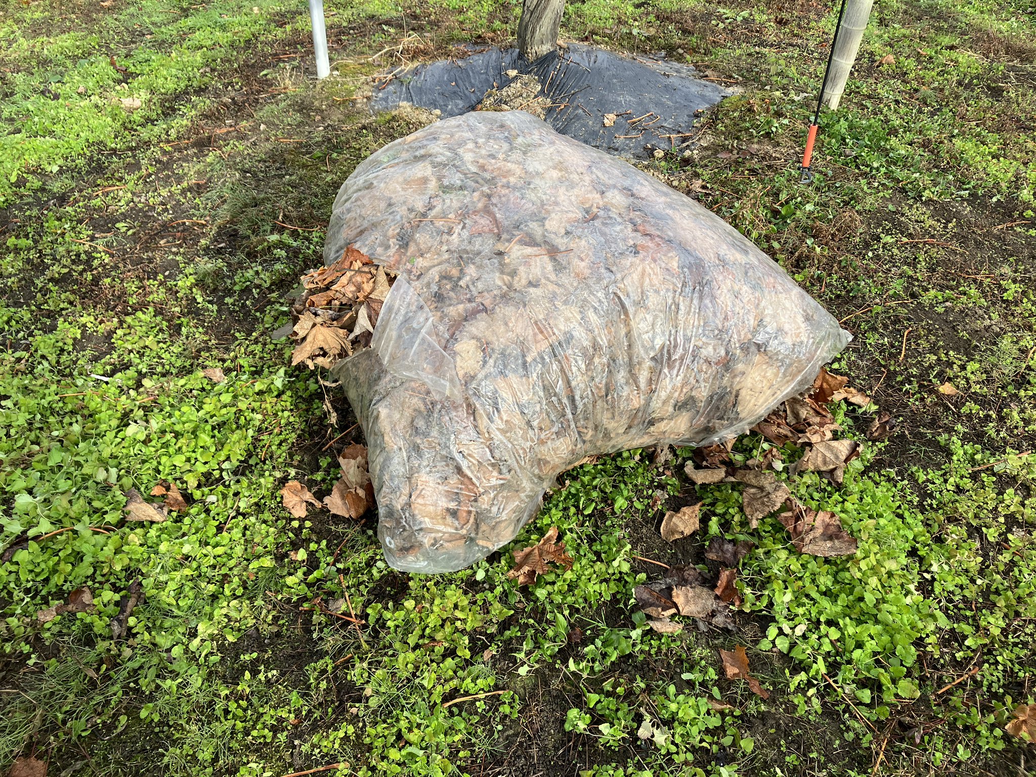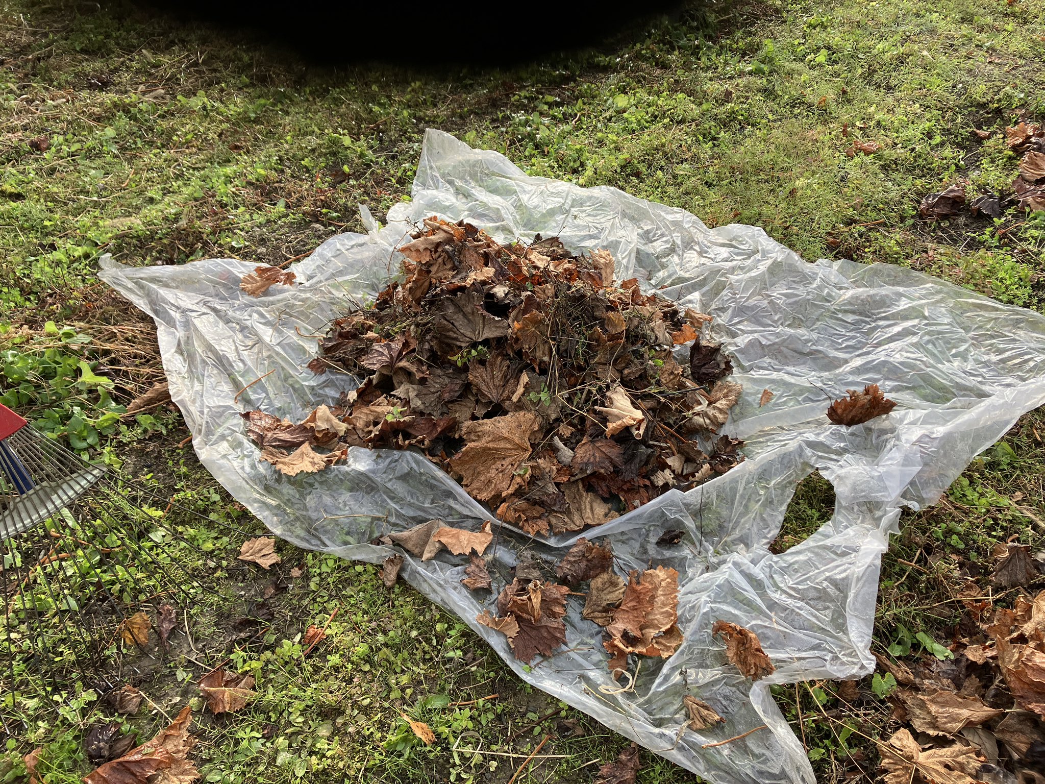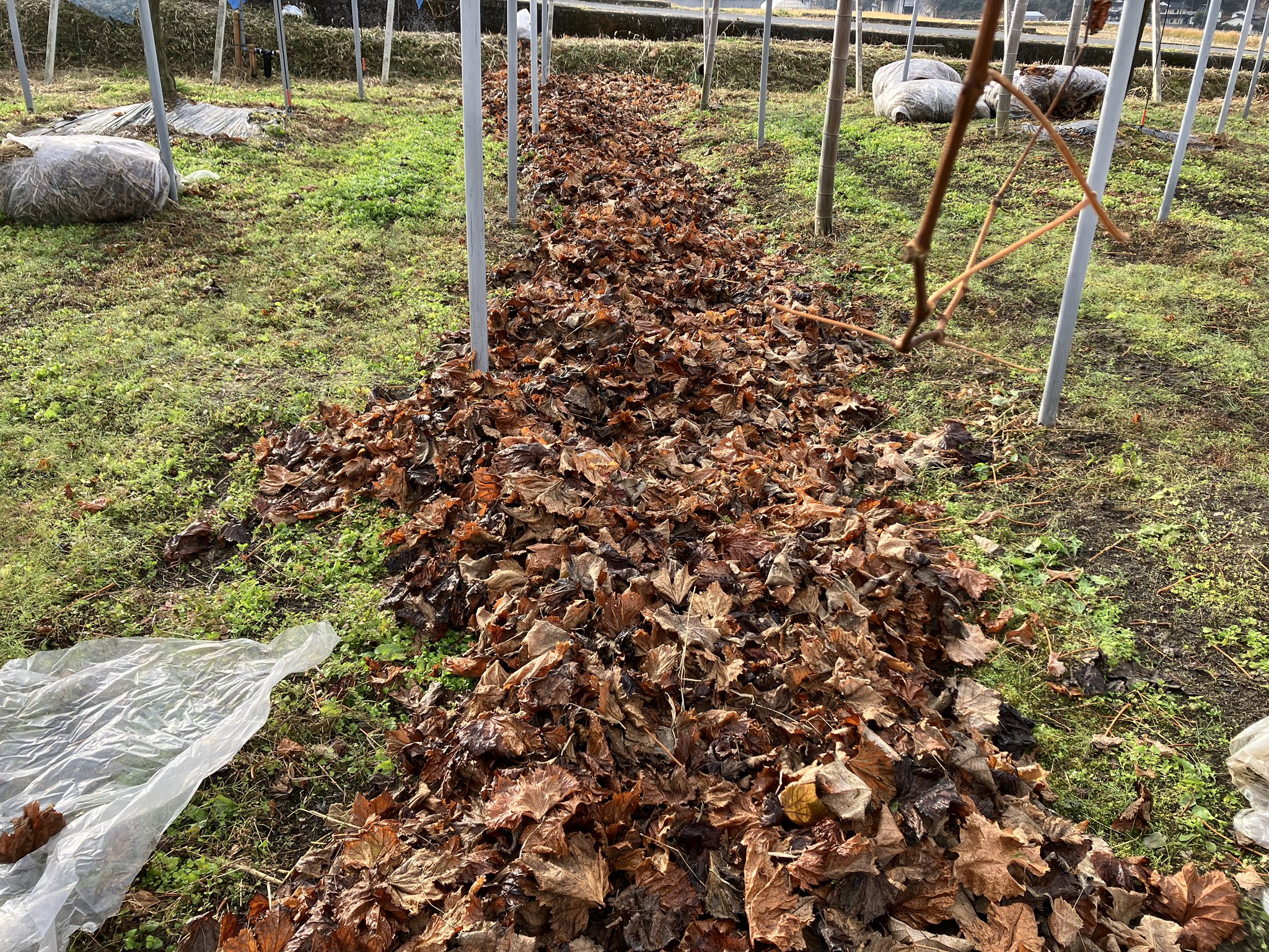 木に引っかかっている葉っぱも全部下に落として、落ち葉をブロワーで集めてまとめます。