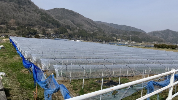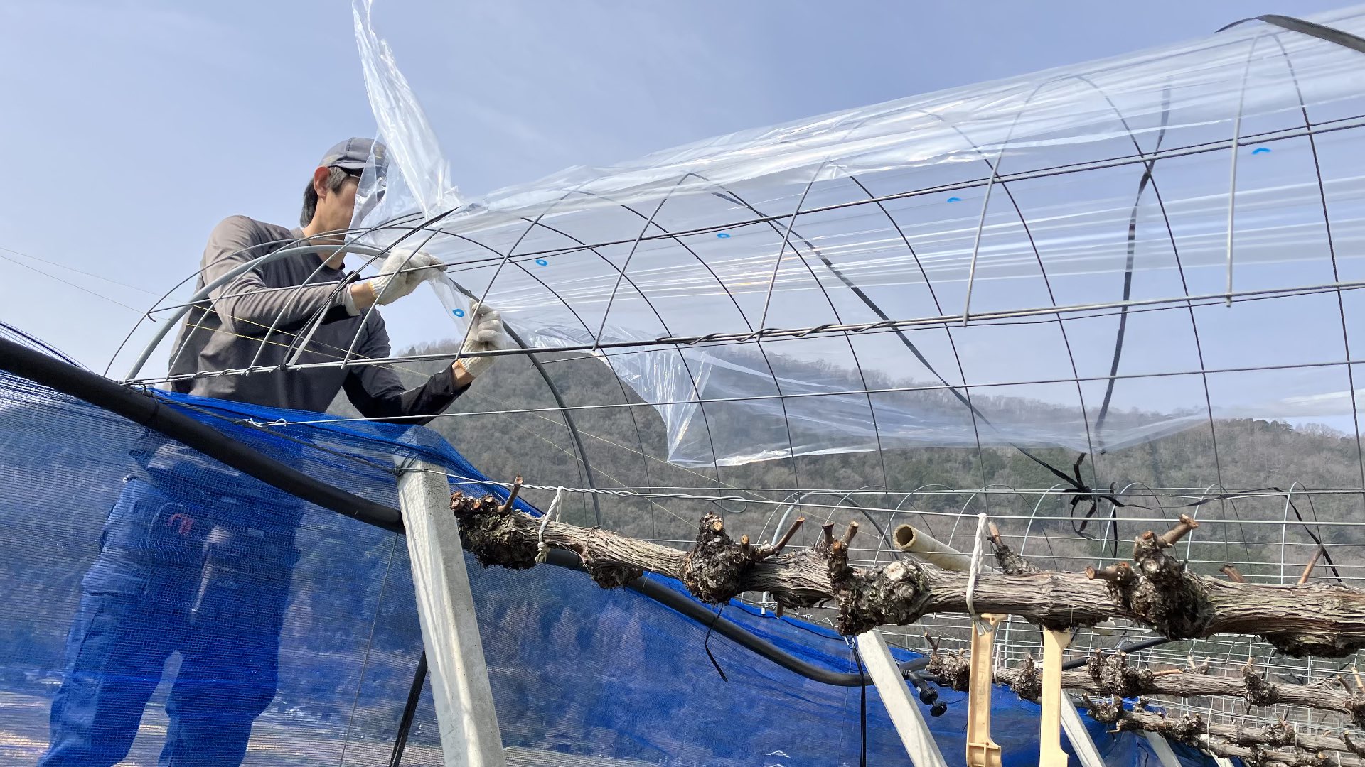 ぶどうシーズンの始まりを告げる、ビニール張り。