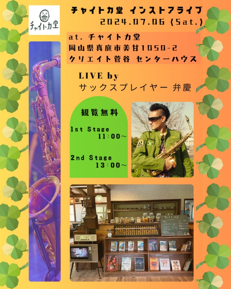 今週末、7月6日土曜日に真庭市美甘のクリエイト菅谷で営業してるチャイトカ堂でインストアライブを開催することに!!