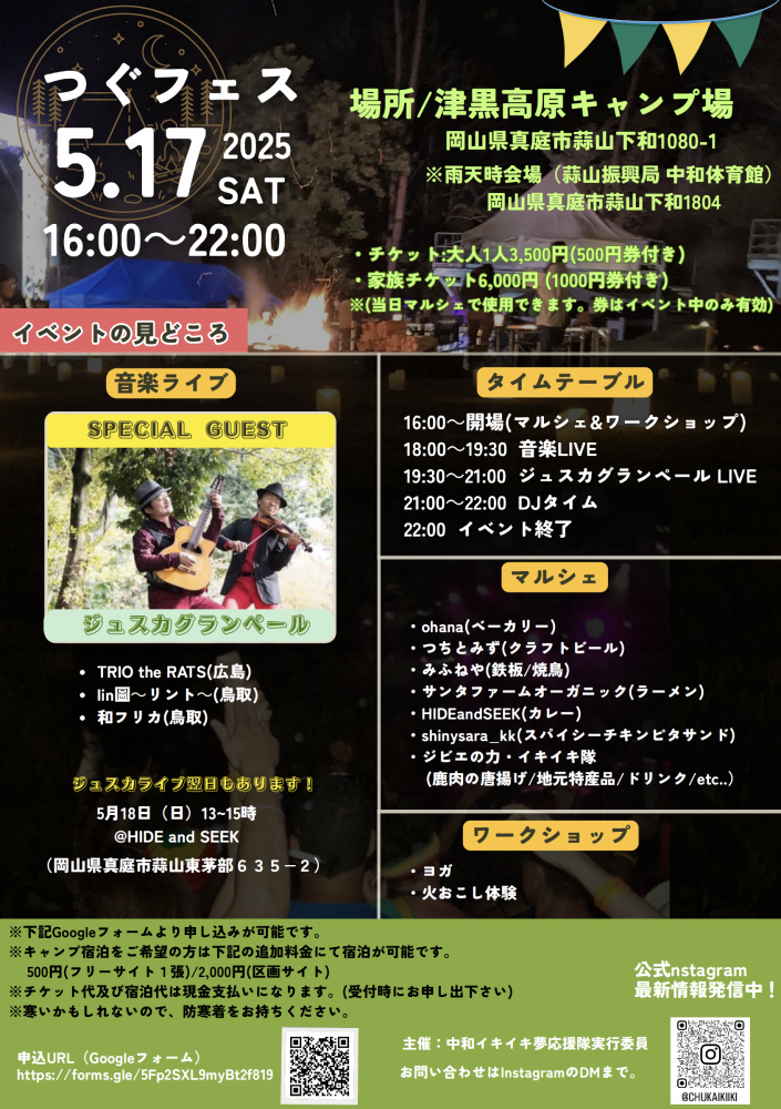 「つぐフェス」では、スペシャルゲストにインストゥルメントバンドユニットの「ジュスカ・グランペール」さんをお招きし、また様々なアーティストによる音楽ライブ、リフレッシュ出来るワークショップ、美味しいものが揃うマルシェブースというイベント内容です。