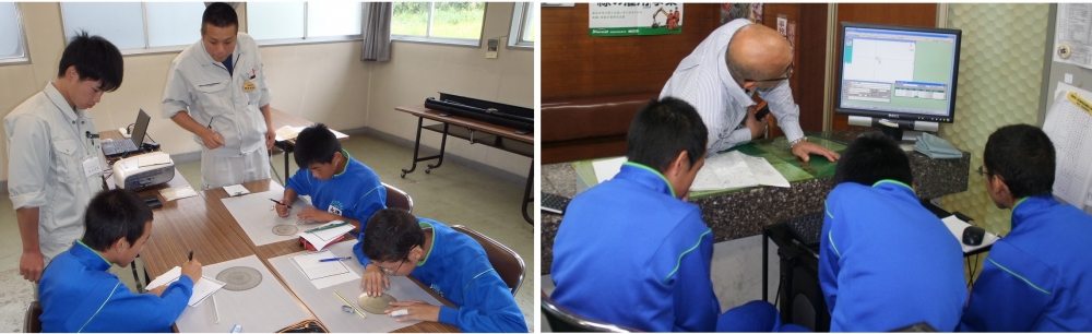 自分達で測量したデータから分度器を使用して製図の基礎を、パソコン用の測量製図ソフトでその違いを学んでます。