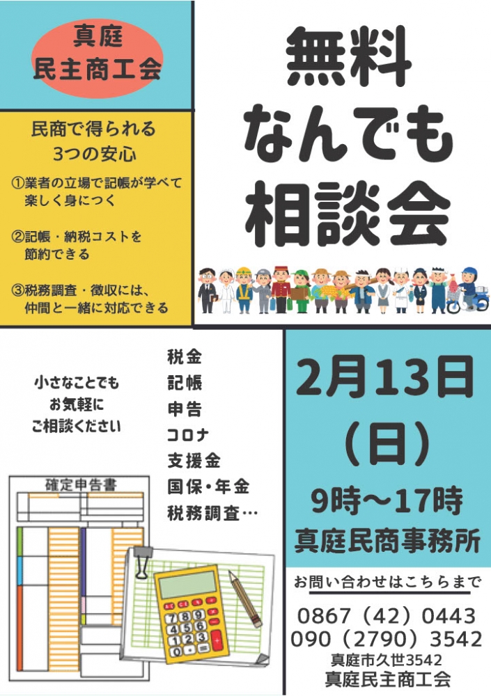 真庭民商では、2月13日(日)に毎年恒例の「無料なんでも相談会」を開きます。