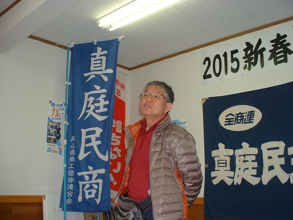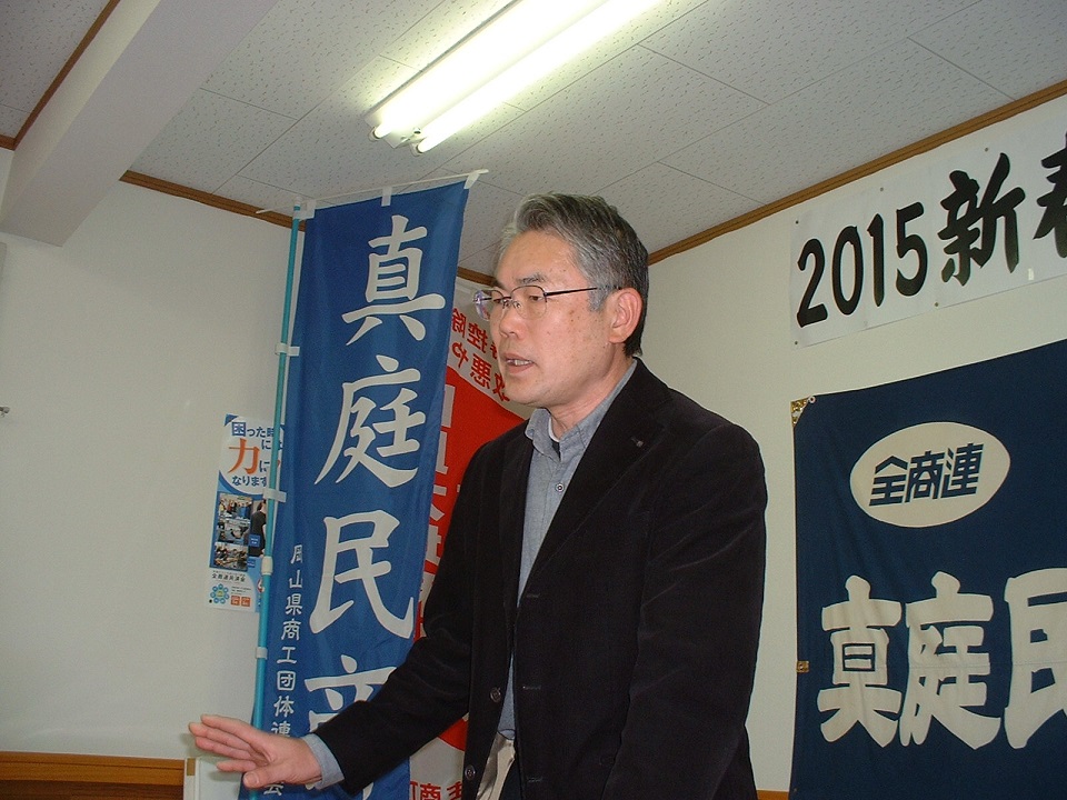 会長のあいさつに続いて岡崎真庭市議から議会報告をしていただき、その後岡山県連事務局長の福木氏より今日の情勢と倉敷民商弾圧事件について詳しい報告と支援の訴えがありました。