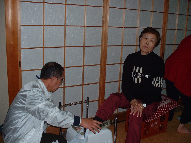 健康チェックは、いつもの血圧、体脂肪、骨密度測定と、尿検査に加えて、新しく「足指力測定器」を使って