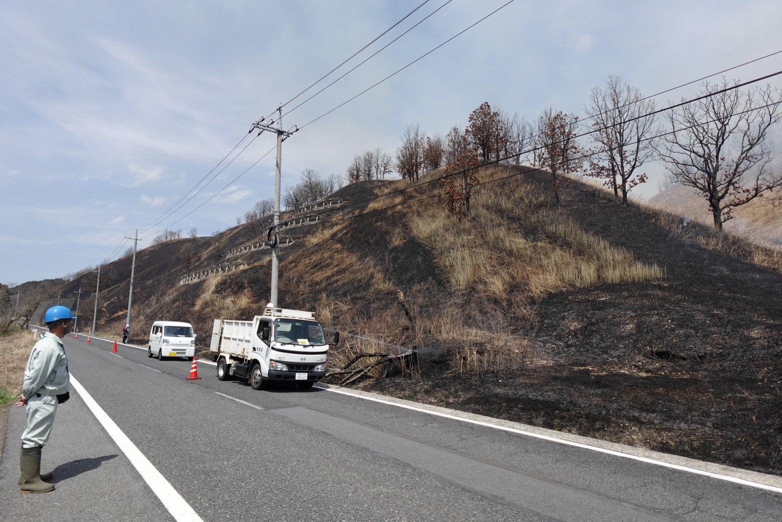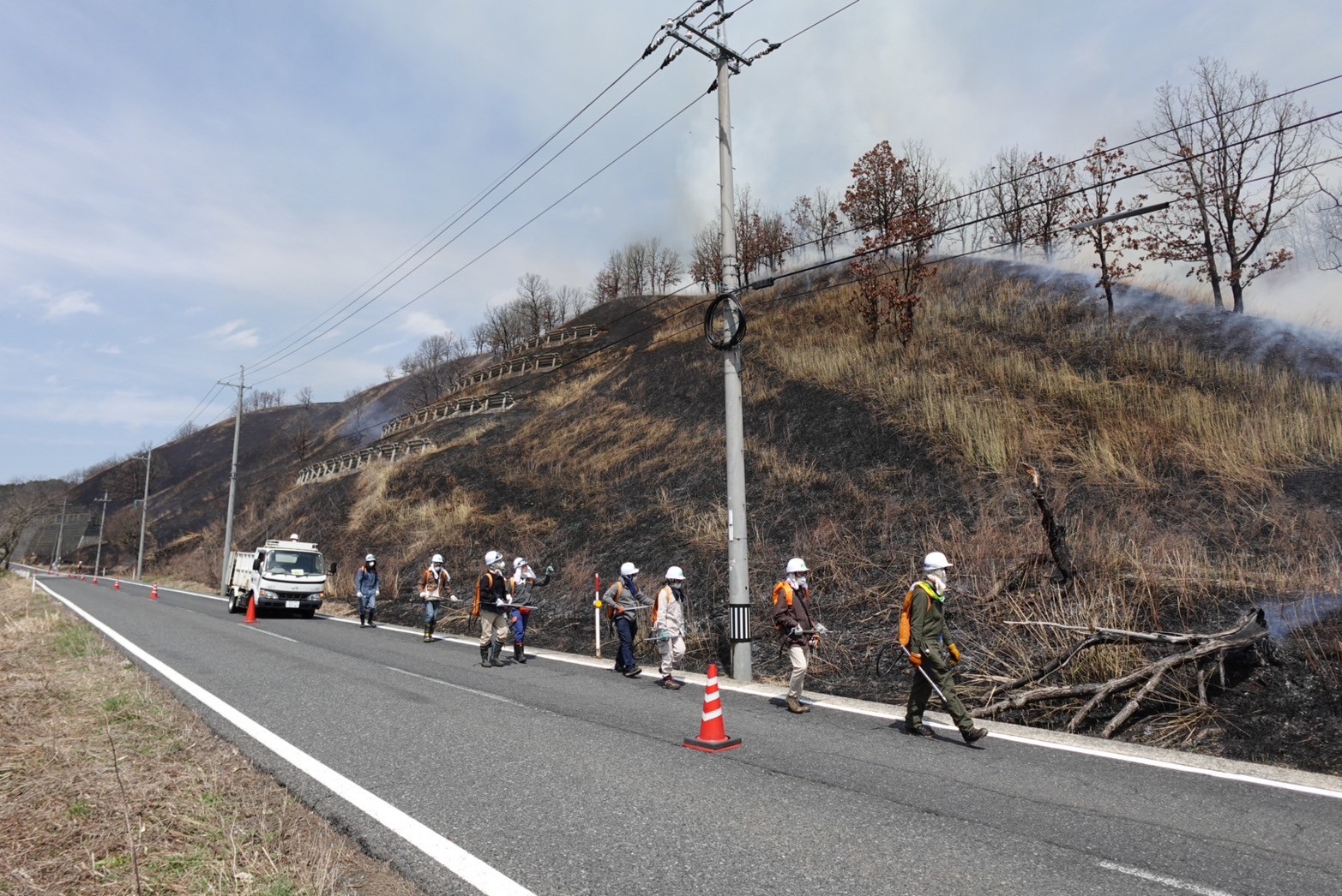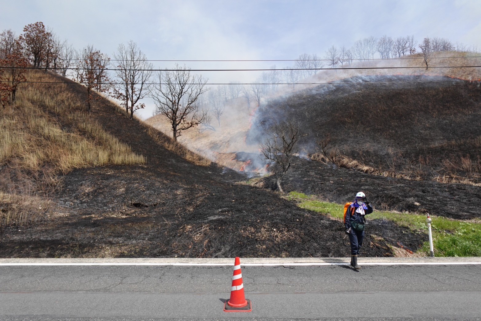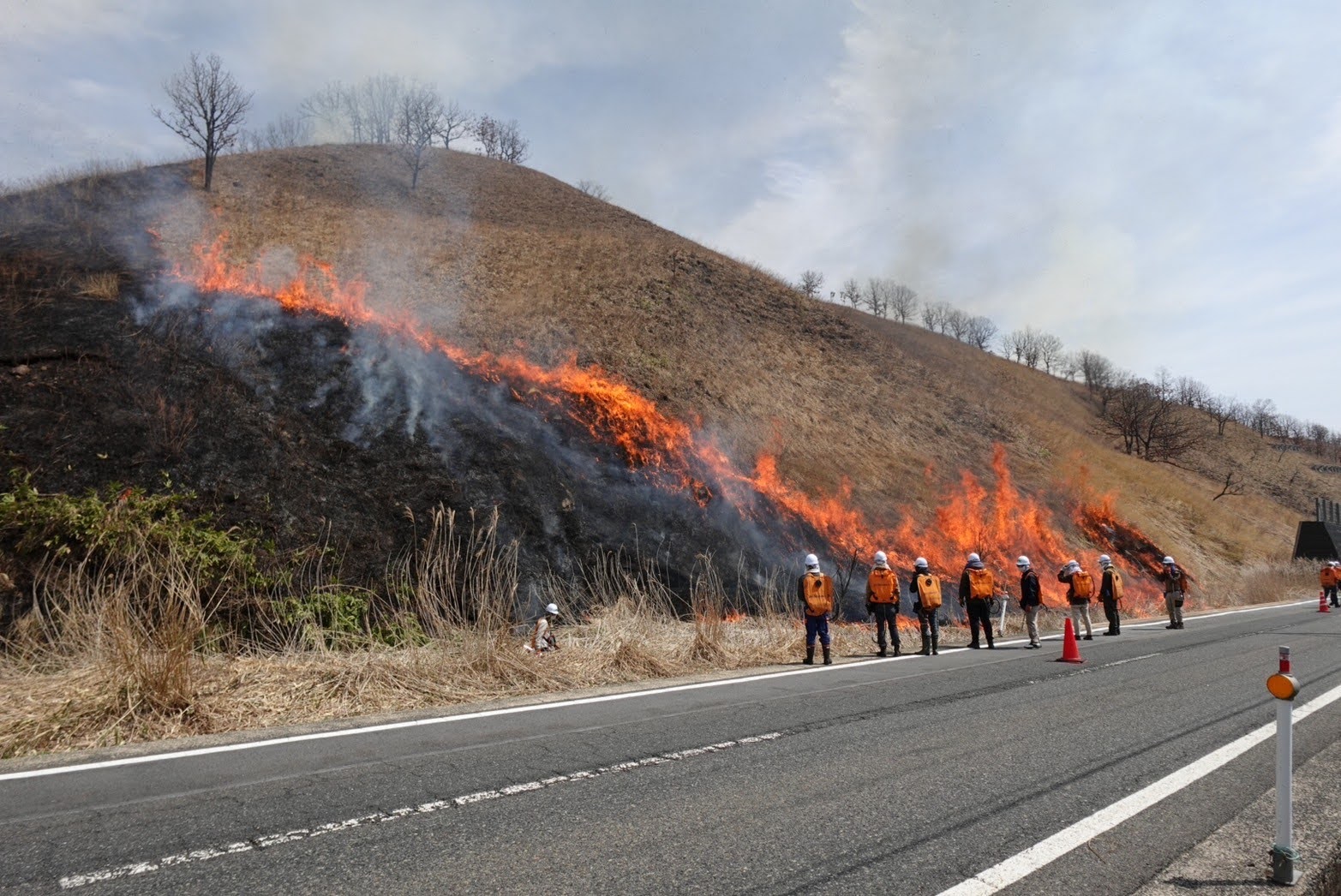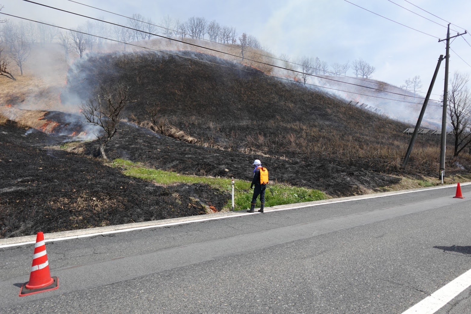 国道沿いに生えている木々に飛び火しないよう、場所によっては草原の中に入る必要があります。