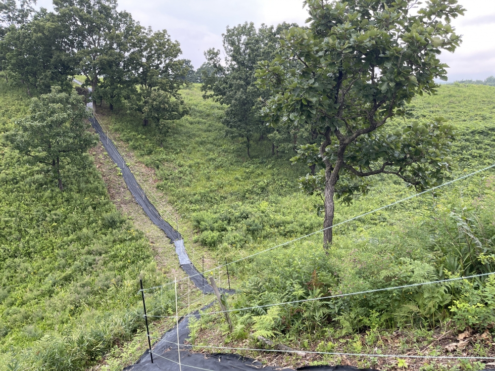 近年、蒜山でも生息個体の増加が進むニホンジカによる植生の食害が 懸念されており、今年度から春~秋までの防鹿柵(電気柵)の設置を始めました。