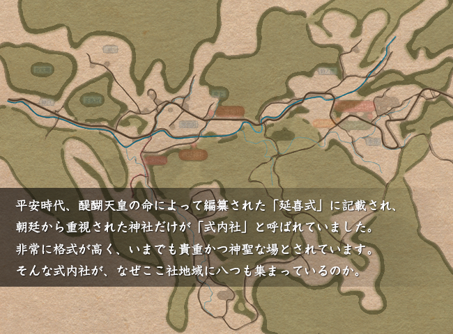 平安時代、朝廷から重視された格式が高い神社は「式内社」と呼ばれていました。社地域には、県内11の式内社のうち8つが集中しており、中世の歴史が残る貴重かつ神聖な場とされてきました。