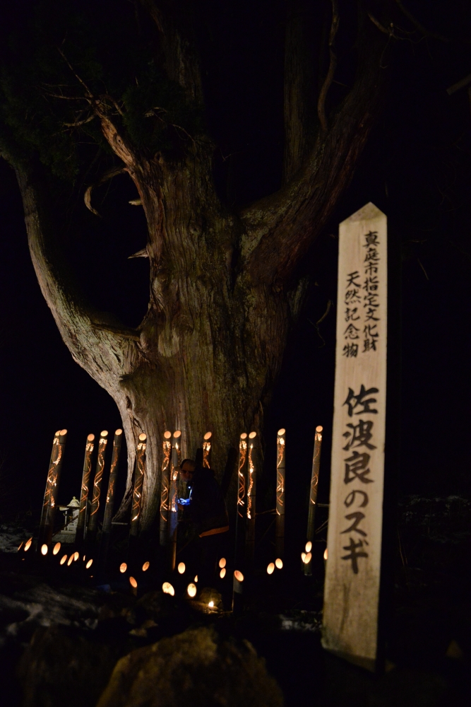 会場は、昨年と同様に佐波良神社・形部神社の境内で、大杉の周りをメインに竹灯籠を灯します。