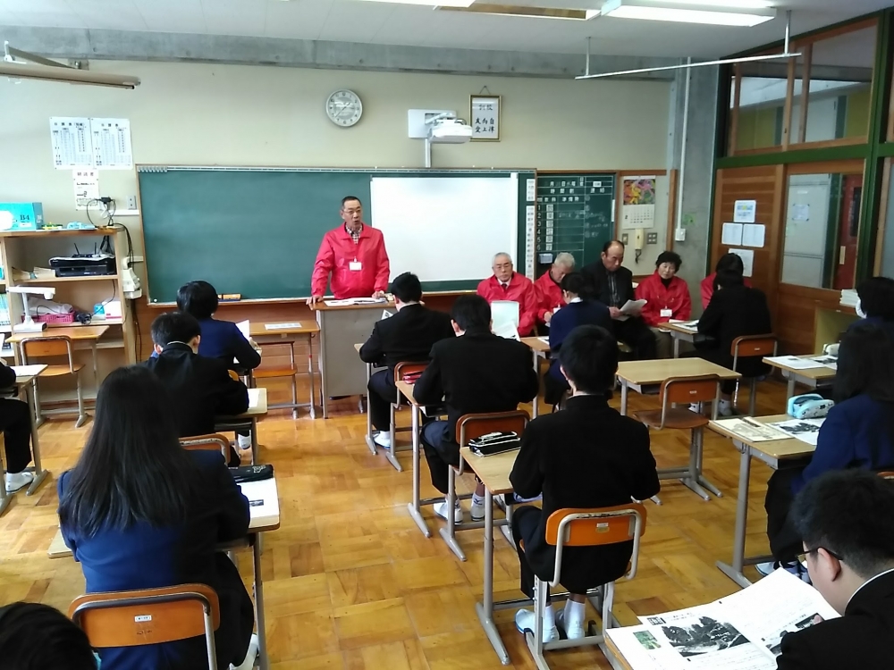 社ボランティアガイドによる授業が、湯原中学校で実施されました。今回対象となったのは、卒業を控えた3年生の生徒の皆さんです。