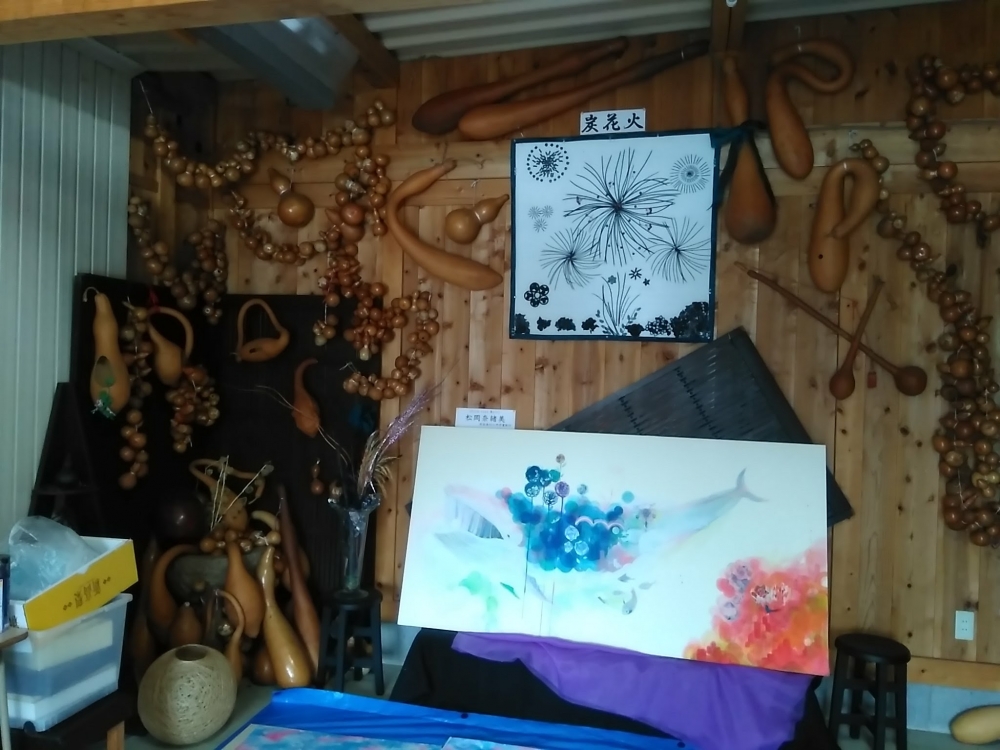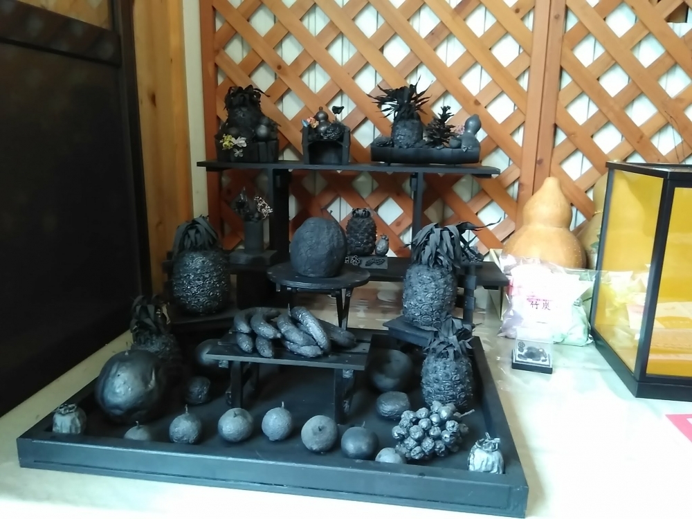 工房では、炭焼き歴15年の奥谷さんが出迎えてくださいました。奥谷さんは、ほぼ独学で炭焼きを学び、今では真庭市・津山市で開催される展覧会に作品を出展されるほど。工房内には、これまで焼いた作品が保管されていました。