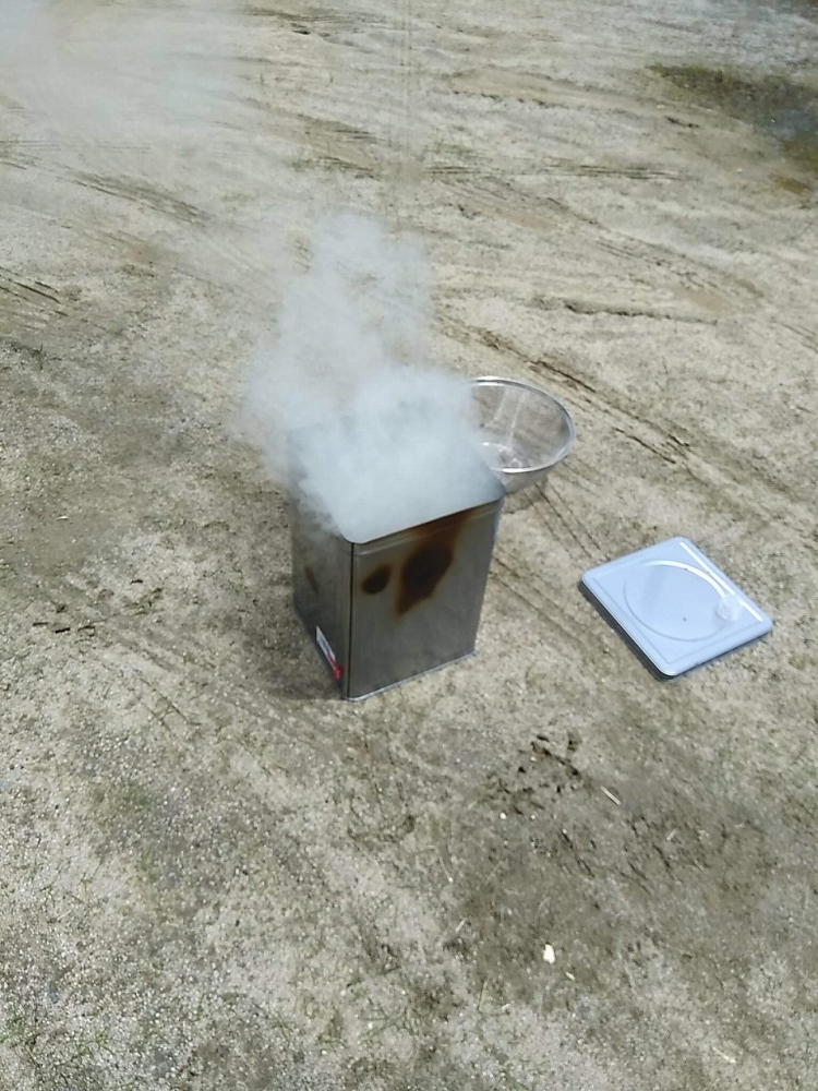 燃え始めると白い煙がもうもうと上がり、しばらくすると煙は透明に。最終的に水をかけて消火してできあがりです。