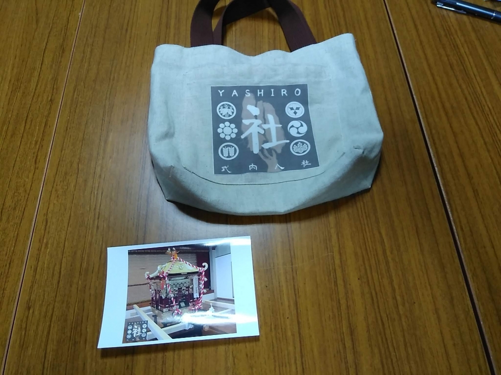 県社の新たな神輿がプリントされたポストカード(写真下)と社トートバッグの試作品(写真上)