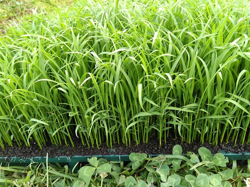 田植えの日も非常に良い天気。狩谷さんの苗はこんなに育っていました。この状態だと、苗を植えてから20日目くらいとのこと。これをこれから田んぼに植えていきます。