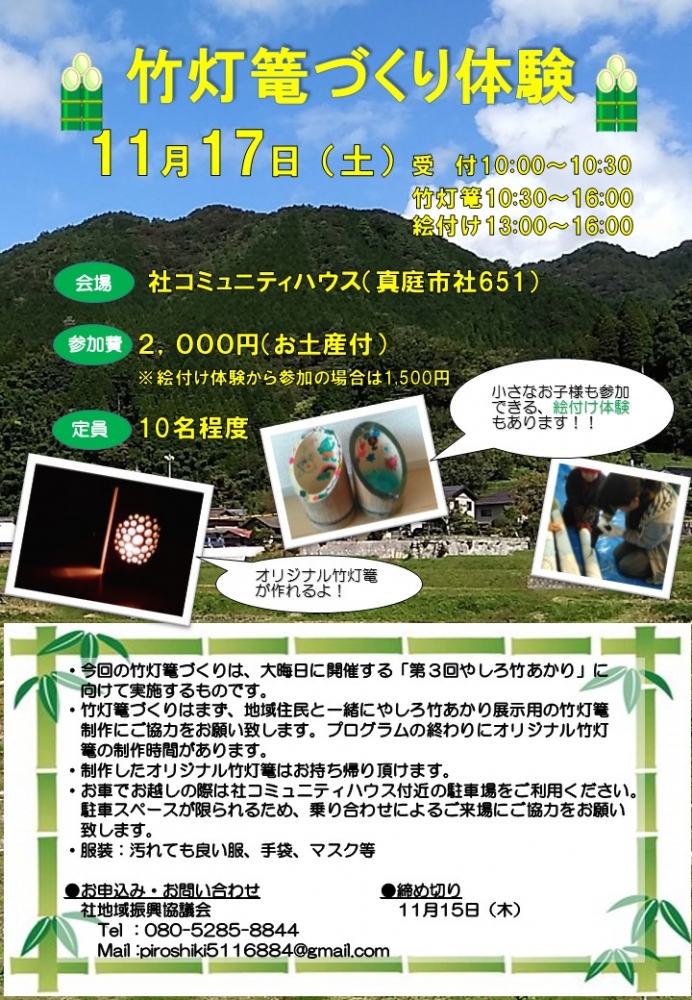 「第3回やしろ竹あかり」に向けて、竹灯篭づくりワークショップを下記の日程で開催します!