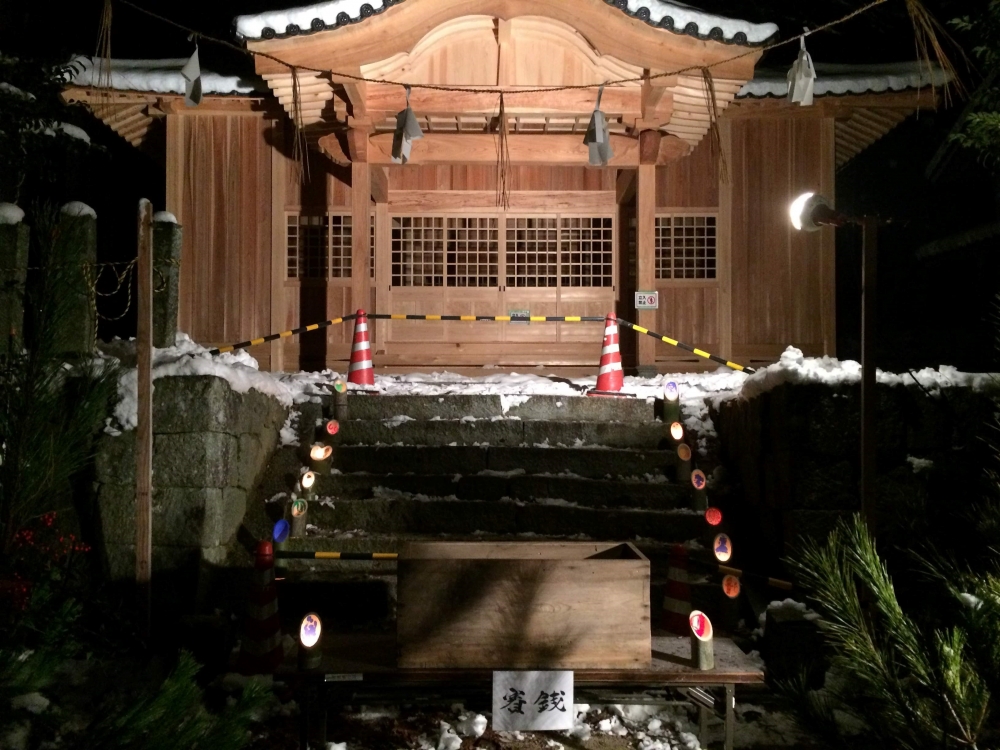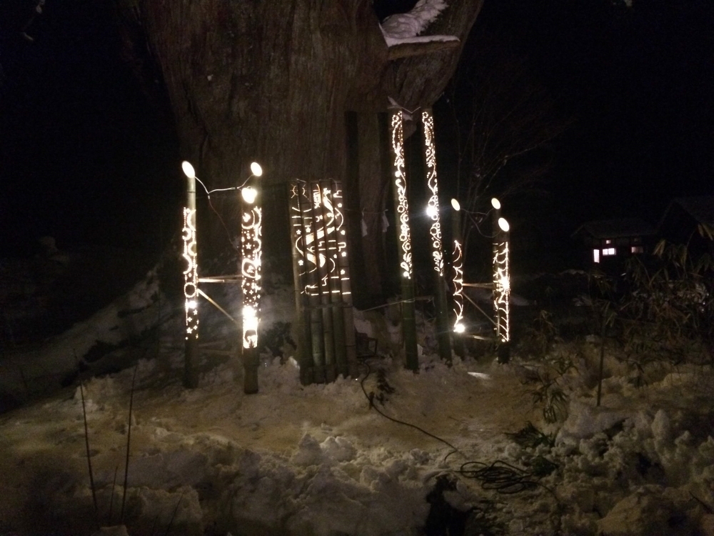 大晦日の夜、佐波良・形部神社には無数の竹あかりが設置され、佐波良の大杉や建て替え中の拝殿もライトアップされるなど、幻想的な空間が生まれました。
