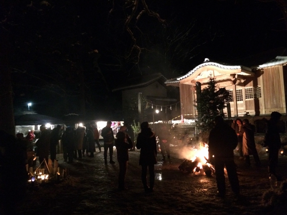 一度解散して、21時に現地へ集合し、キャンドルやかがり火の準備。23時頃になると少しずつ参拝客が増え、年が明けると一気にピークを迎えました。境内では、地域の皆さんにより破魔矢の準備の他、無料の甘酒や温かいおうどんがふるまわれ、参拝に訪れる方々との交流も生まれていました。