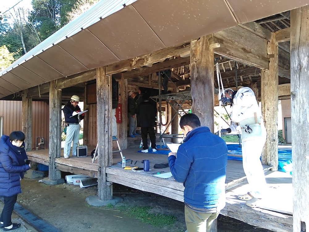 本調査は、一日かけて岡山県内の建築士の皆様により行われました。今後、茅葺の再生が予定されている大御堂ですが、この建物がまずはどのような状態なのか、ということを調べるとのことです。