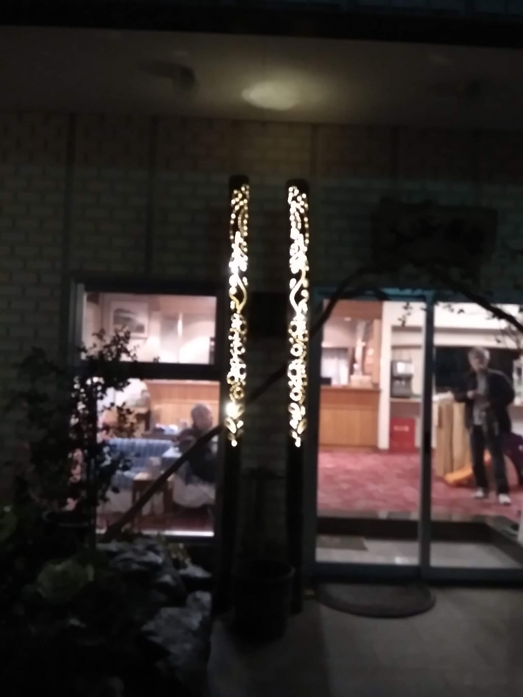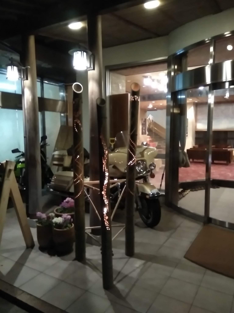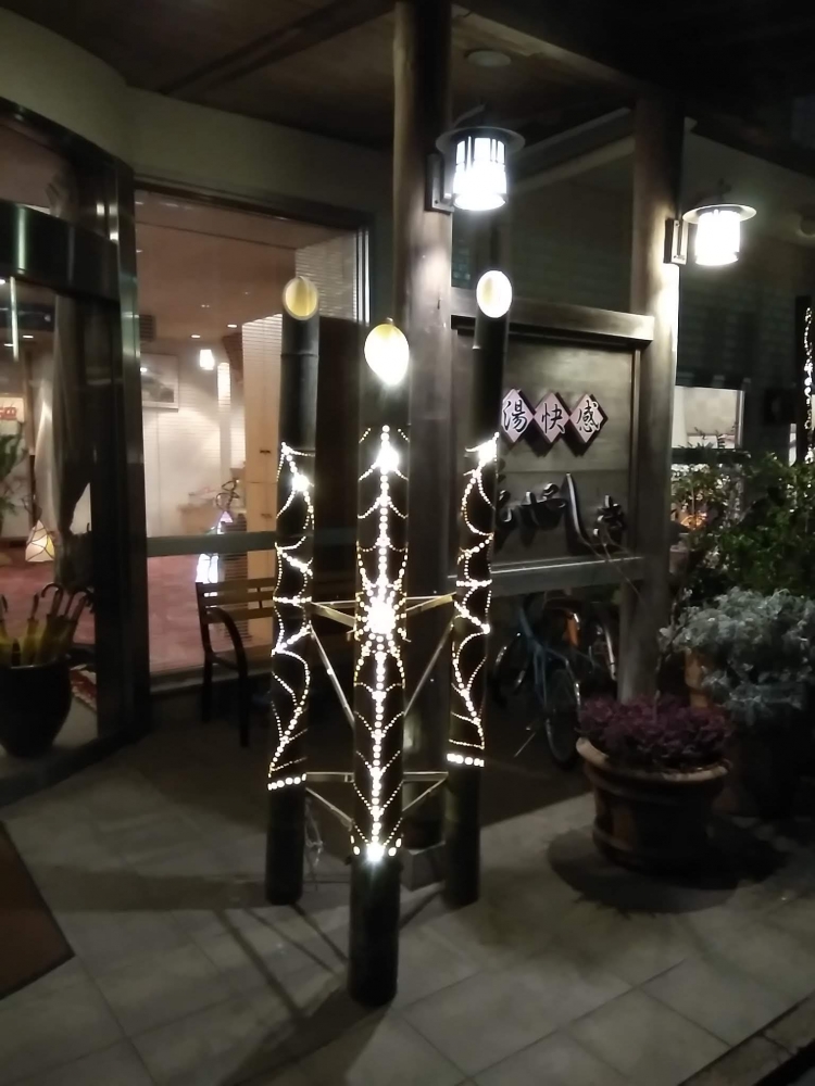 その竹灯籠を旅館協同組合様を通じて湯原温泉街のどこかに設置できないかと調整した結果、「湯快館 花やしき」様に設置させて頂けることになりました!!