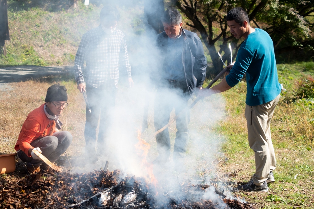 落ち葉や枯葉を集めるかかりと芋を包むかかりに別れて、