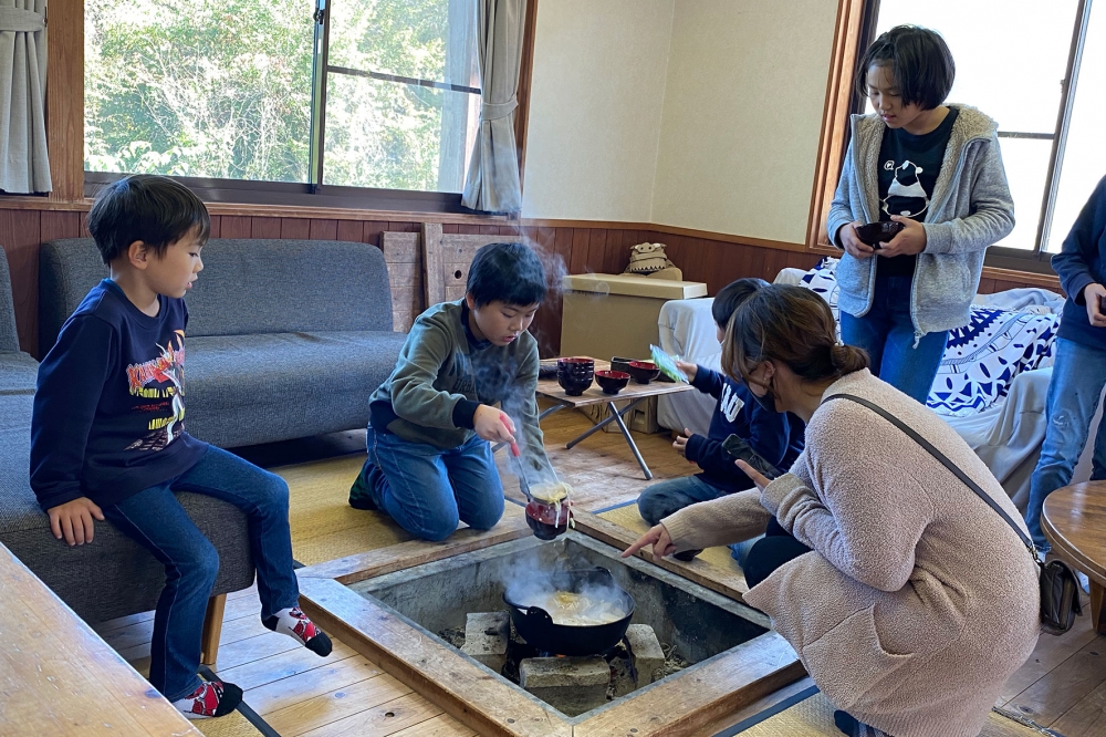 焼きあがる時間を待っている間は囲炉裏にセットした豚汁を食べてもらって。